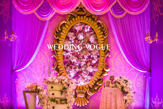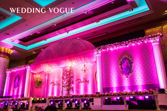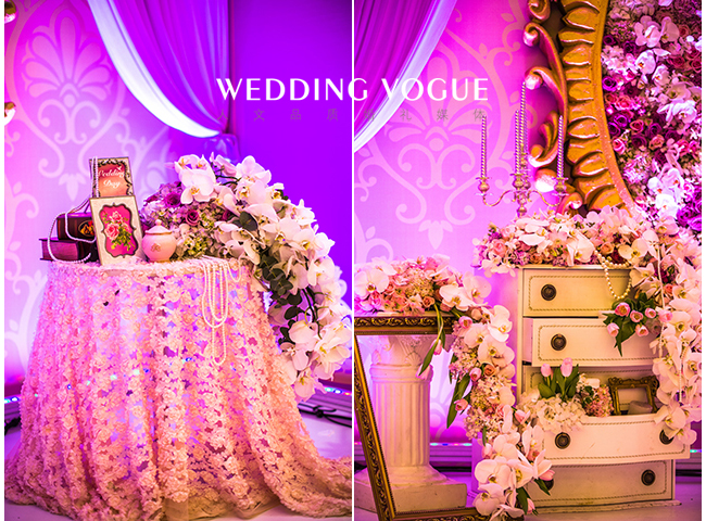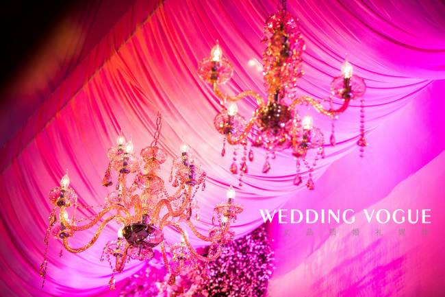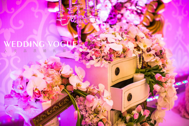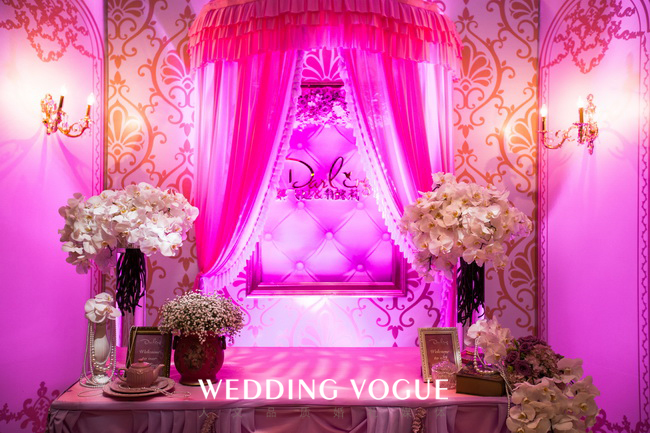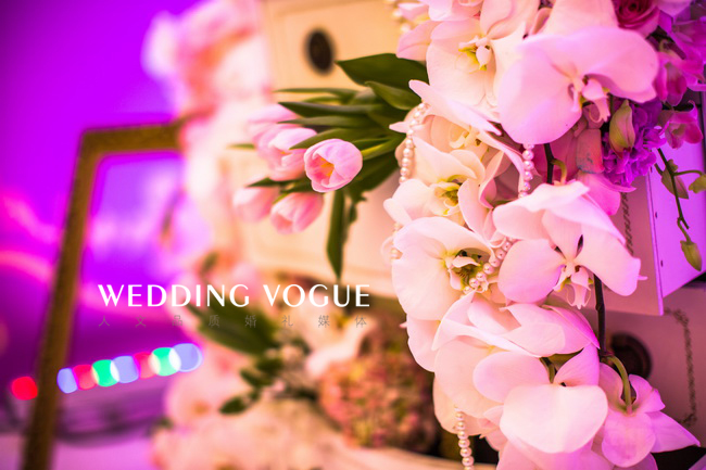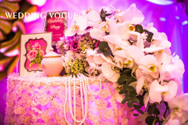 纤弱娇媚、华丽精巧、甜腻温柔、纷繁琐细,这一场典型的洛可可风婚礼,设计师选用粉紫色系,使整场婚礼的色彩更加娇艳、光泽闪烁。