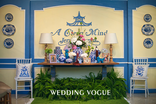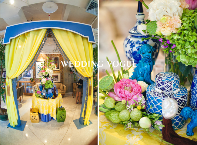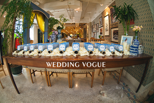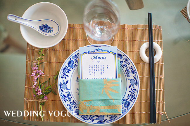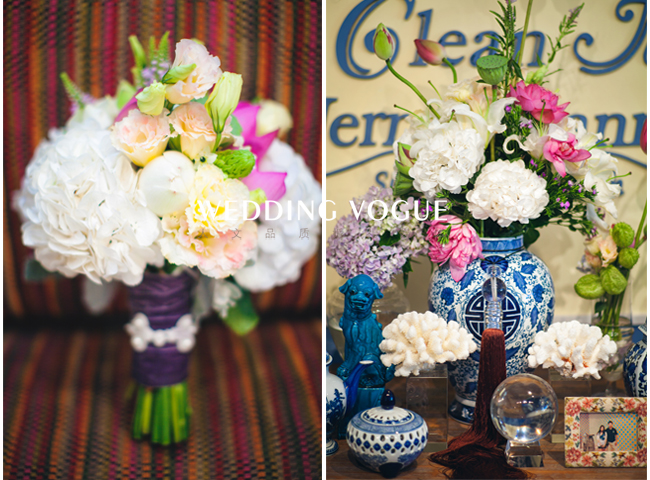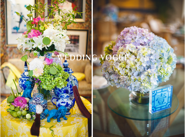 在美国生活的艺术系新娘有着浓郁的东方情结,青花瓷和静雅古典中注入西式元素,张弛有度,中式的大红色混合西式的奔放设计,更加的明快大胆,奔放中不失温和,素净中不失大气。