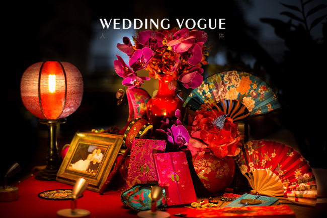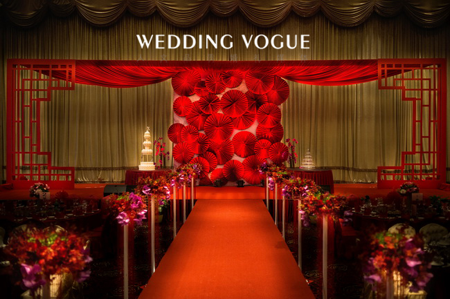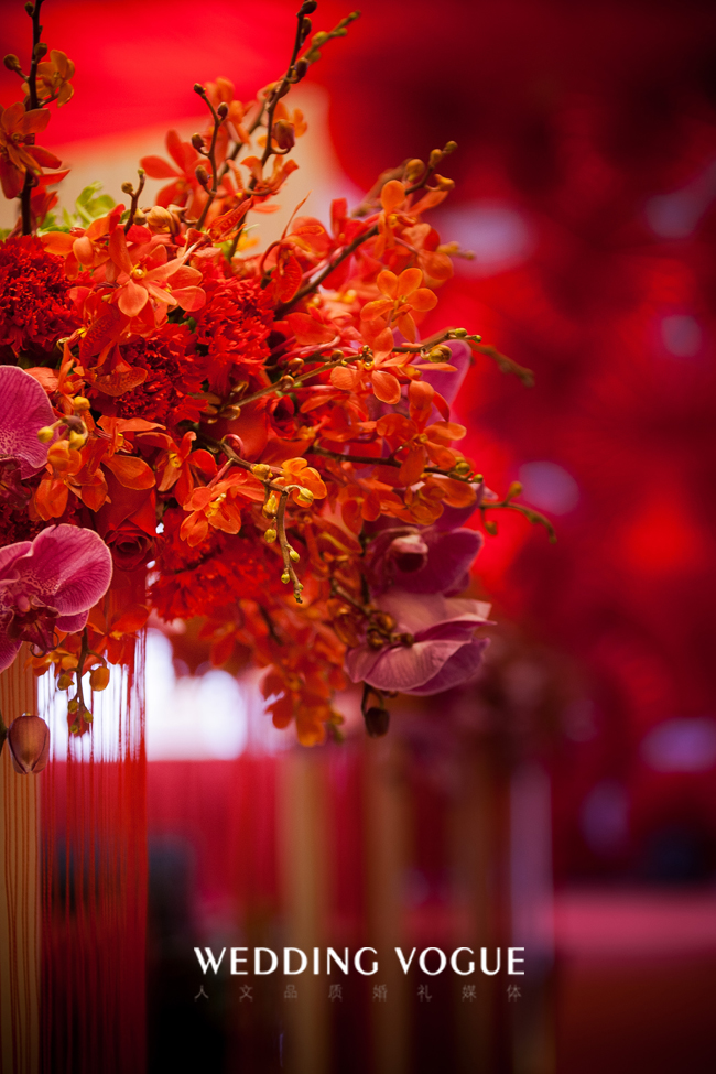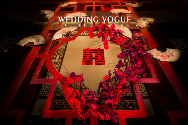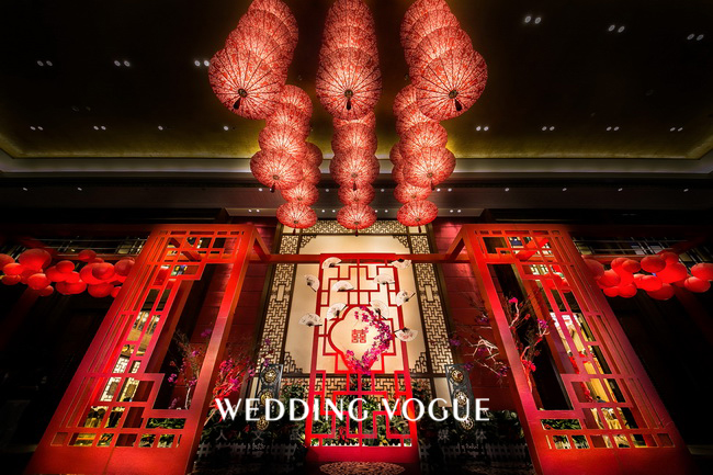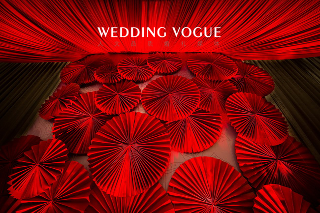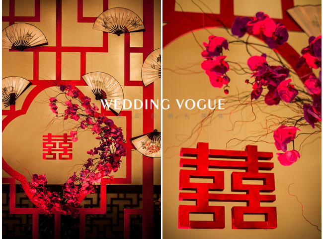 这场中式的设计系来自于待嫁女子的闺阁之物,胭脂,作为本场的设计来源。一是场地本身的考量,系粤式风情的中式韵味;二是胭脂是中国古代泛指泛指鲜艳的红色,也是我们这一场的主题色;三是引自词“”香腮冰洁,胭脂无染去粉饰;云鬓浸漆,青丝如瀑落玉簪;四是“醉”表达了令新郎倾心的是新娘子的“红妆束素腰,谁家女儿胭脂俏”。