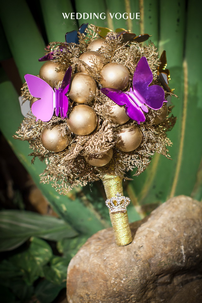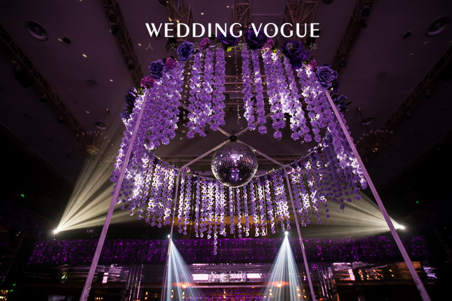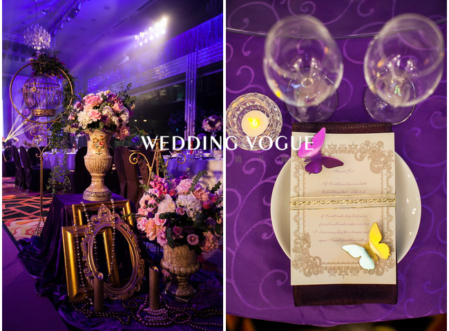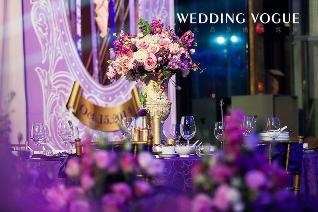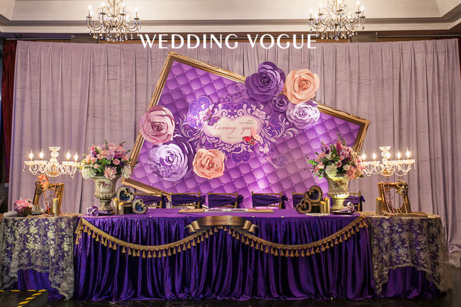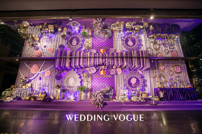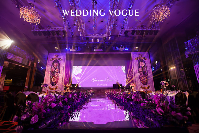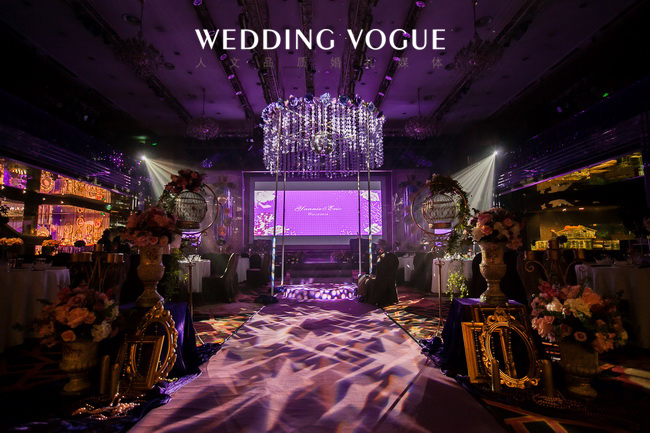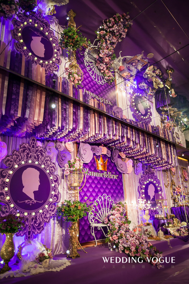 你要相信世界上一定有你的爱人,他一定会穿越这个世界上汹涌着的人群,他一一的走过他们,走向你。他一定会怀着满腔的热,和目光里沉甸甸的爱,走到你的身边,抓紧你。正因如此,Yannie要求在婚礼上播放《终于等到你》,爱是进行时,婚礼是一个Beginning。中山小榄国宴婚礼,情迷紫色。