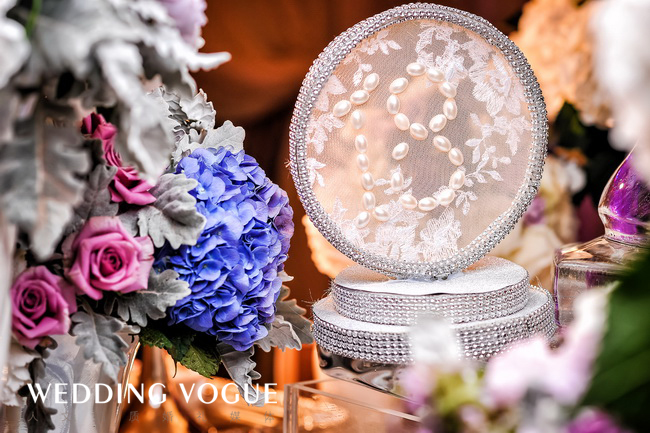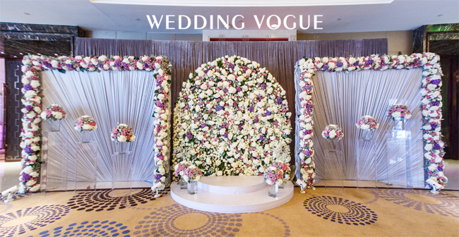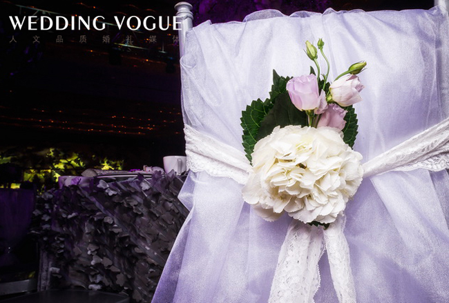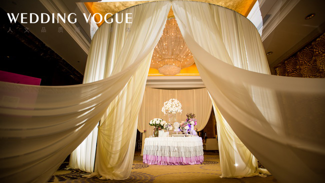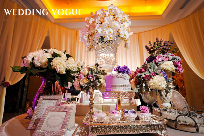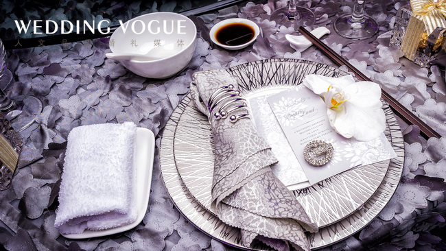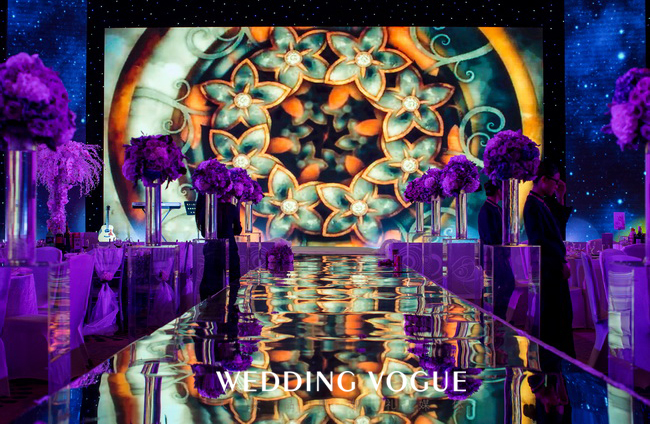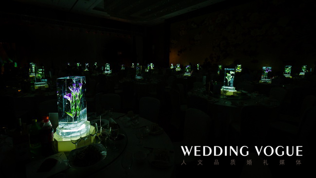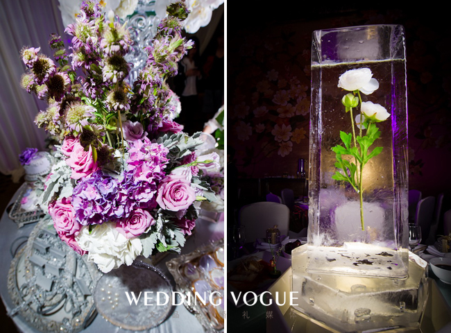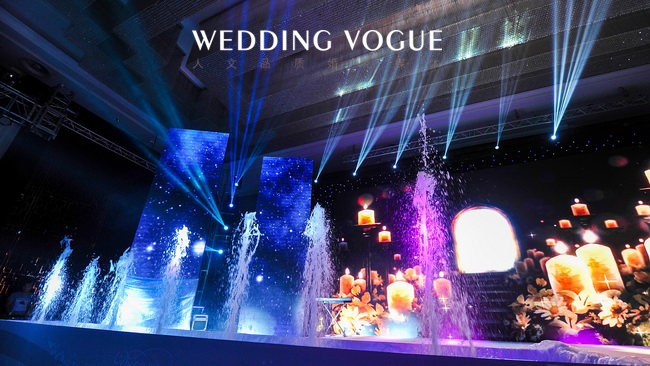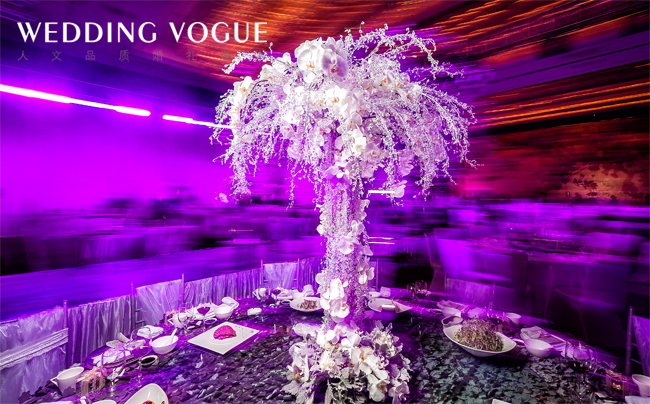本场婚礼设计灵感来源刘德华夏日FIESTA演唱会,国内首创用于婚礼的室内20米大型喷泉,宴会厅内大量的冰雕加上银色、灰色、白色和紫色的搭配,让这场盛夏的婚礼充满了清凉、舒适和神秘曼妙的元素。