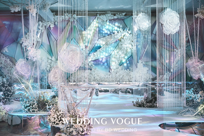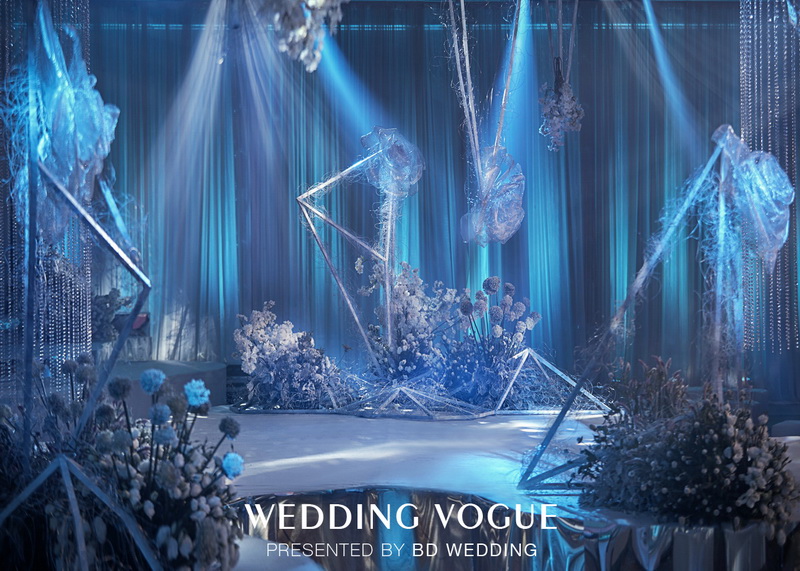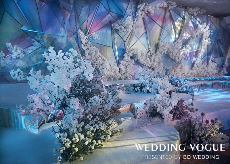 这次婚礼秀的灵感主要来源于一张泰森多边形的图。图片中,镭射色调及多变三角形结合与搭配,产生了一种奇妙的化学反应。基于此,BD Wedding研究了各种多边型,比如泰森多边形,阿基米德多边形等等一系列多边形的形态与计算方式。