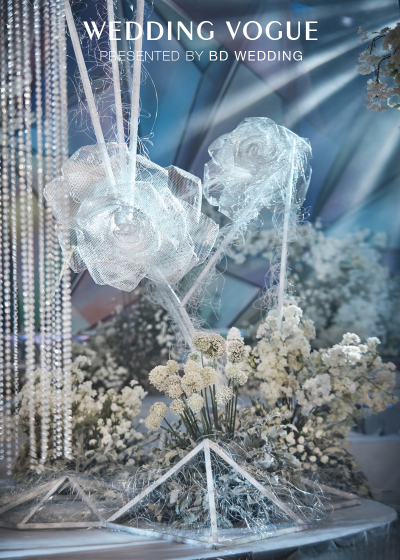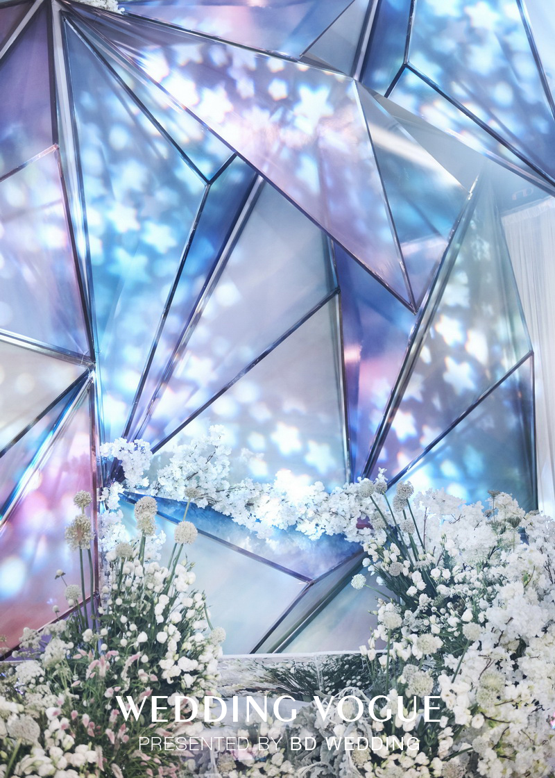 婚礼现场使用了大量的几何体,散发着五彩的金属色光泽,显得硬朗而简洁。在结构与线条的处理上,BD Wedding又使用了一些弧形圆形,搭配大量的白色花材,使整个现场刚柔并济。
