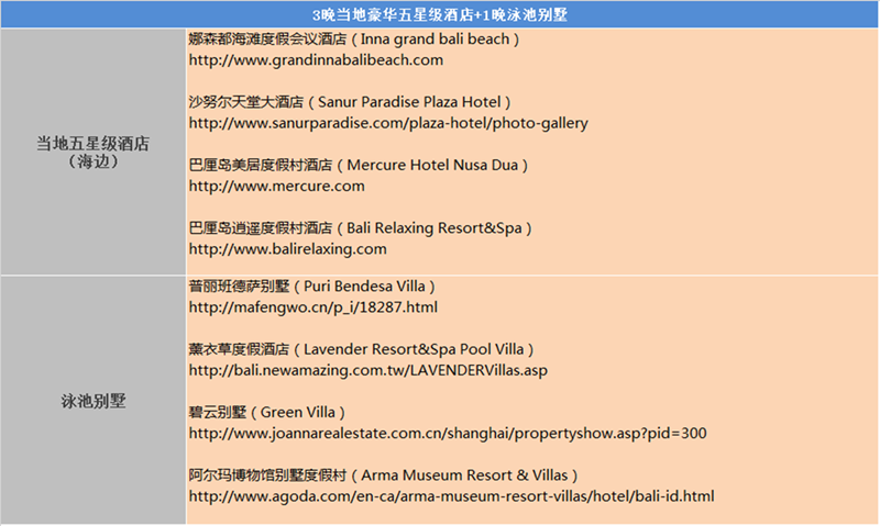 附:费用包含---巴厘岛五天吃住行(住宿酒店为以下酒店,均为巴厘岛当地五星级酒店和独立海岛别墅)