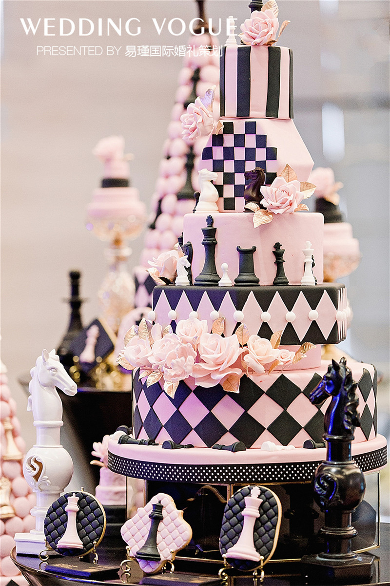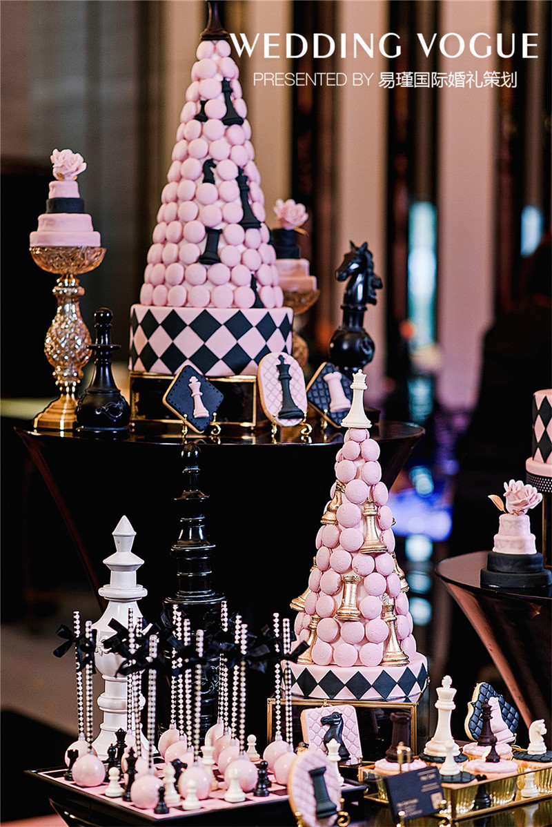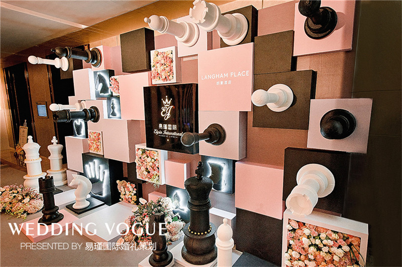 此次设计的主色调突破性地选用了粉色黑色为主色,柔中有刚,刚中有柔。而在主要元素的选择上,易瑾国际婚礼策划机构这次选用了国际象棋,既与酒店的风格相吻合,又表达了一种人生观:人生就像一盘棋,我愿意做你的皇后,你就是我的国王。我们棋逢对手,相恋相依,一同走好人生的每一步。