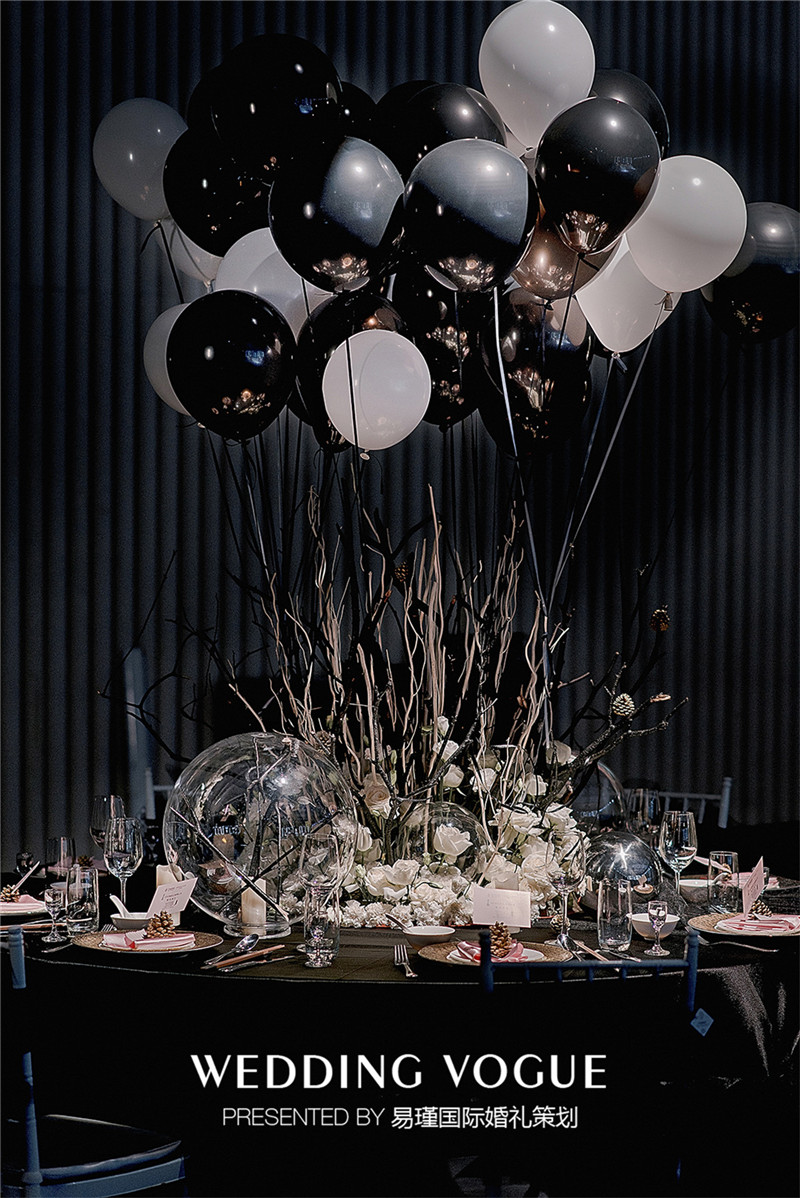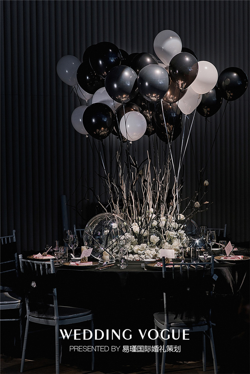 名为“世界和平”的圆桌和名为“世界之光”的长桌,采用了黑白气球、羽毛,雨伞等夸张的元素。圆桌的灵感来源于其形状的圆满和黑白气球的冲撞色,寓意着不管两者有多少不同,白天和黑夜始终连在一起,黑白最终能够和谐共处。而“世界之光”的长桌,则寓意着每一份爱都是从心底散发出来的,每一段感情散发着光芒。