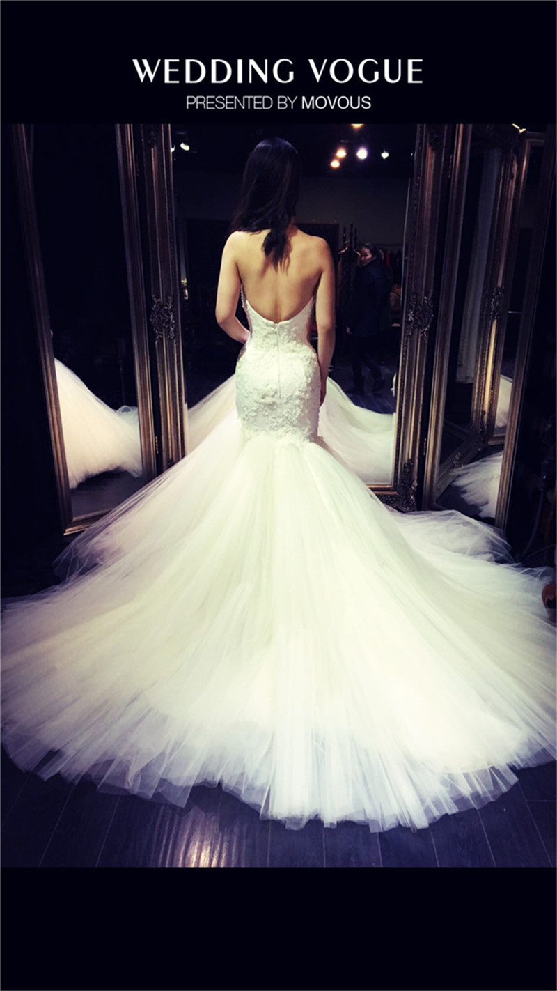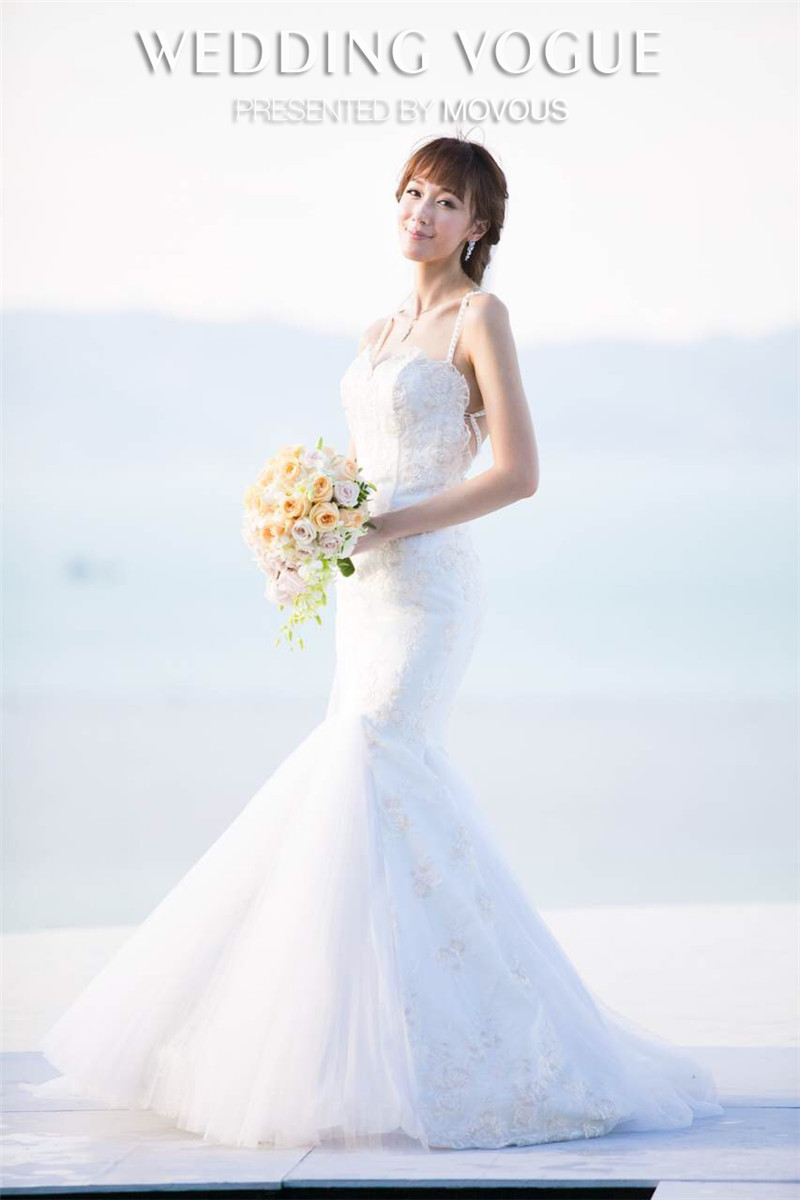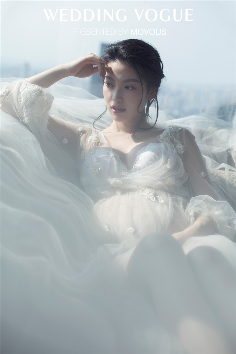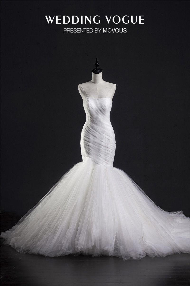 说起Movous的婚纱,不得不提她家的侧托鱼尾。看似简单的纱裙,却是由一束束的白纱错落有致地绕着礼服高低排列而成,抛弃裙撑,柔软的纱布层叠出整个轮廓。静止时拉长曲线,走路时摇曳生姿,侧托鱼尾无论坐姿抑或动态,永远呈现一个完美的形状。而新娘则在婚纱的包裹下,拥有了一个360度无死角的纤细腰身和修长腿部。