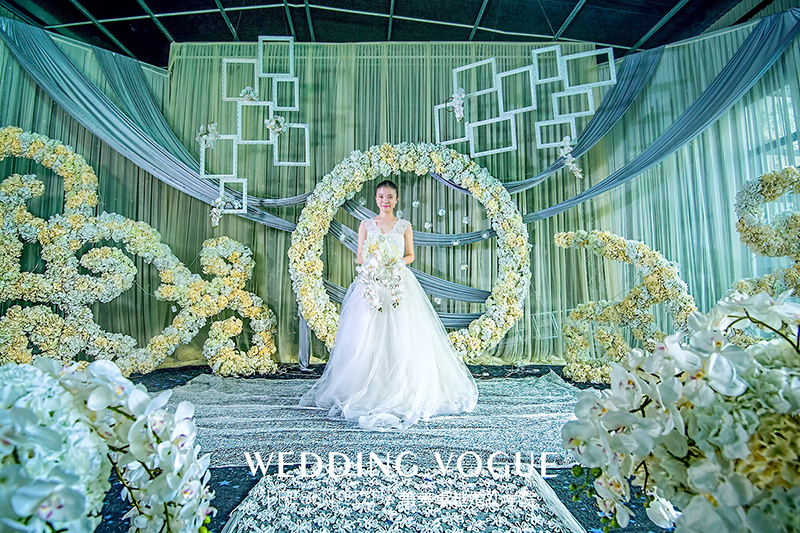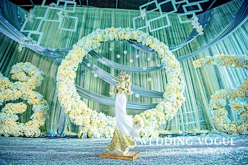 在这场主题婚礼的创作中,也是由三部分拼接组合成主舞台,两侧虽是大小不同的异型花架,但中心的圆形则是寓意着“圆满”“完善”。