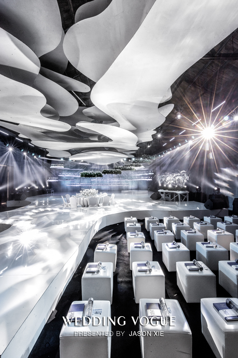 整个发布会的空间色彩零克拉采用了极简的纯白色调,婚礼空间的氛围以同种色系的马蹄莲来做提升,再通过灯光的渲染虚实结合,使得发布会的整个空间悬浮立体化。同时,零克拉还将大量装置艺术运用到宴会设计上,利用Flat Design扁平化的设计手法,将极简的线条,扁平化的铺陈,通过立体的多层次拉升,让顶部悬挂和舞台背景巧妙地融为一体。此举也呼应了这次发布会的主题“原来你我相爱”——为了迎合对方而去刻意改变自我,其实爱情的模样,就是最真实的自己。其实你我早已融为一体,陪伴着自己的呼吸。