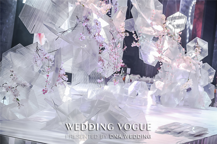 “和新娘Miya认识半年多,她经常聊起他们的恋爱故事,还会告诉我她的梦。梦到自己在月亮上,梦到美丽的雪。新人是在美好的下雪天认识的,新娘的气质也很婉约,仿佛是新郎的月之女神,所以我就想把月宫、雪花的场景表现在婚礼上。结合新人留学澳洲的经历,他们接触的是现代简约的文化,所以我们为他们打造的也是一种现代风格的月宫。”