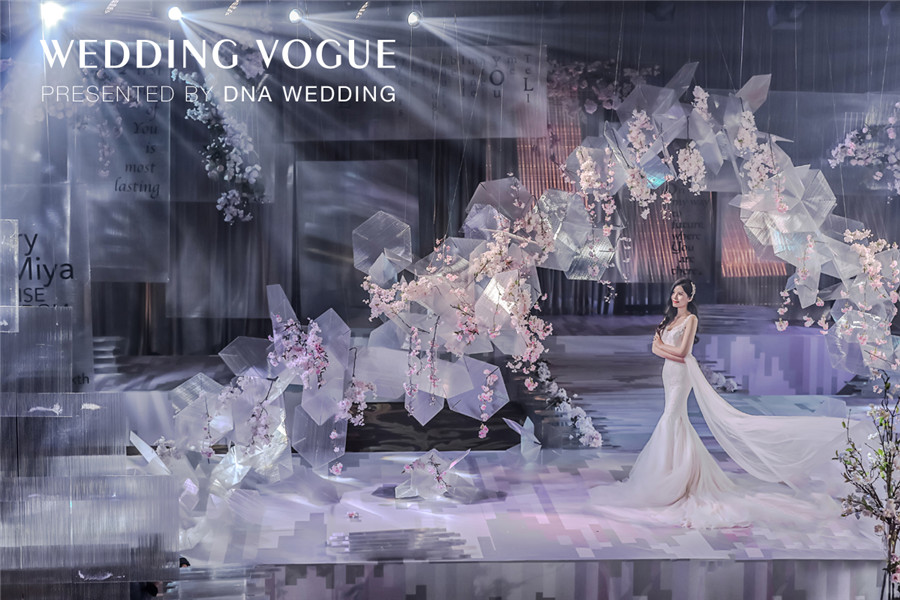 这种“不可复制”的婚礼设计过程自然也会遇到很多困难。在雪花瓣材质的选择上,由于使用的是不太常用的微晶透光板,需要在短时间内掌握材质的功能性,并反复试验其可行性,这对于策划团队来说也是一个小小的挑战。