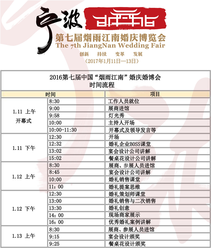 2017年1月11日—13日,第七届中国“烟雨江南”婚庆博览会将于宁波玉玺婚庆会馆盛大举行。本次婚庆博览会本着创新、持续、变革、发展的四大行业发展精神为宗旨,不仅会特邀政府、金融、互联网、婚礼业巨头出席,提案分享宴会设计及婚企管理的相关理念。还将分别联袂10家全国顶尖宴会设计机构参与宴会设计和桌花设计比赛,更有全国顶尖灯光设计机构参展灯光秀。魅力烟雨江南,1月11日—13日,期待与你共聚!
