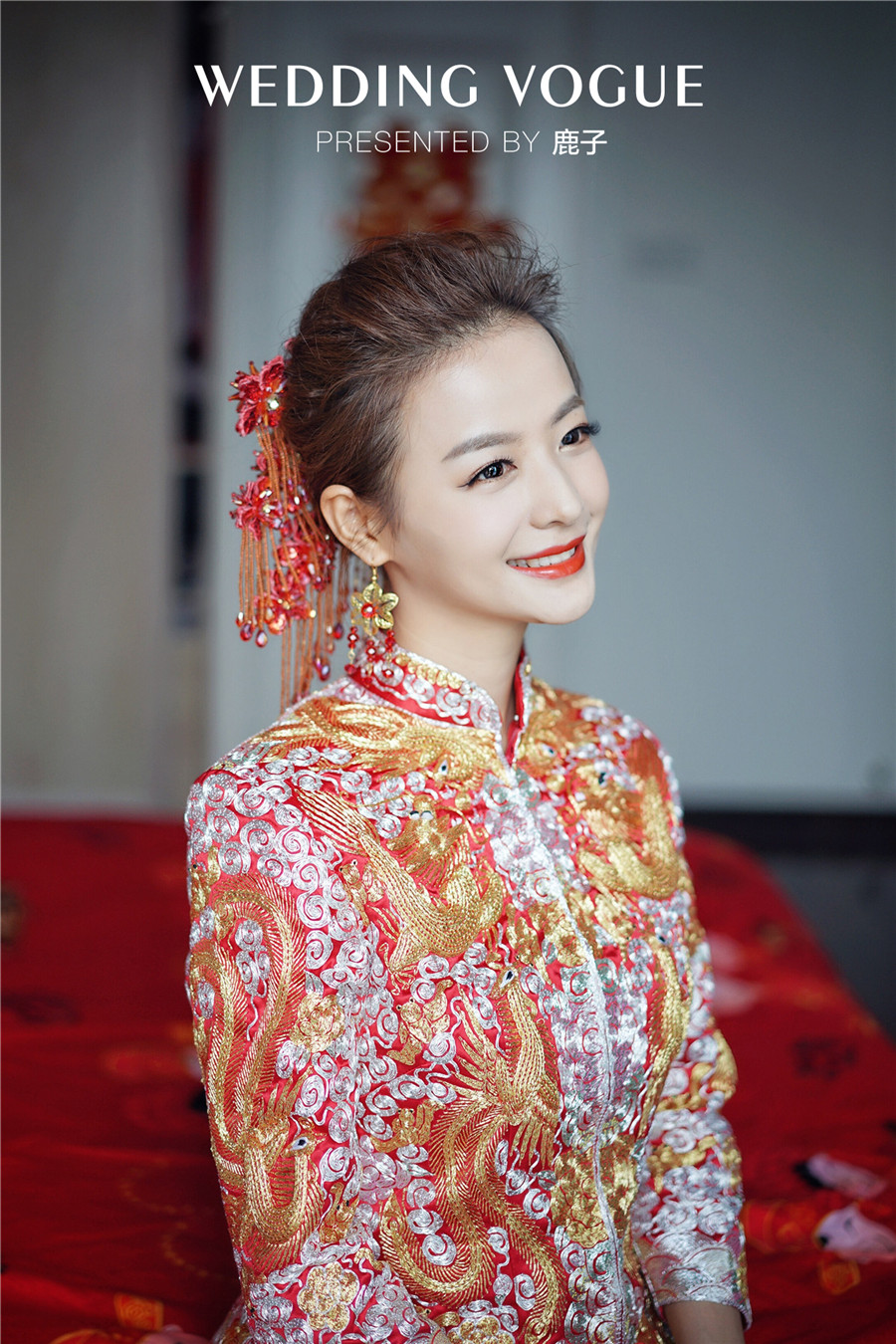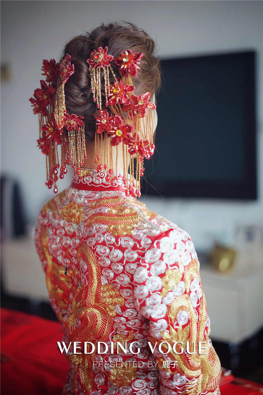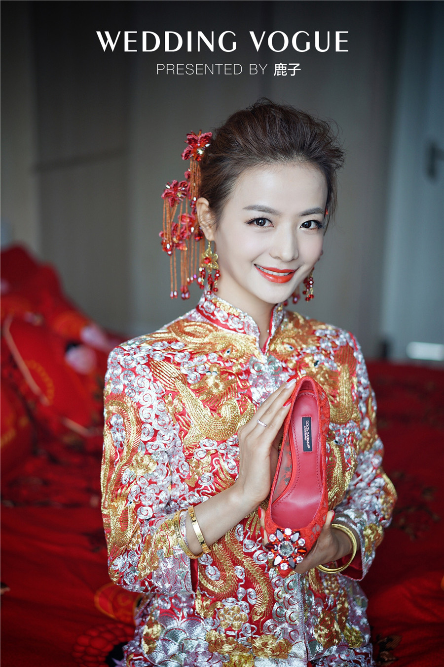 婚礼的龙凤褂,讲究的是金丝银线的刺绣技艺和龙凤呈祥的传统纹样,一直是我们粤港等地的婚礼传统服饰。随着明星的示范力量,开始在全国流行起来,也同时衍生出合适各样的中式造型。燕燕的中式造型我们并没有用传统的金钗银钗,而是巧妙搭配讲究的施洛华世奇水晶红色系头饰,整体造型更清新更个性。