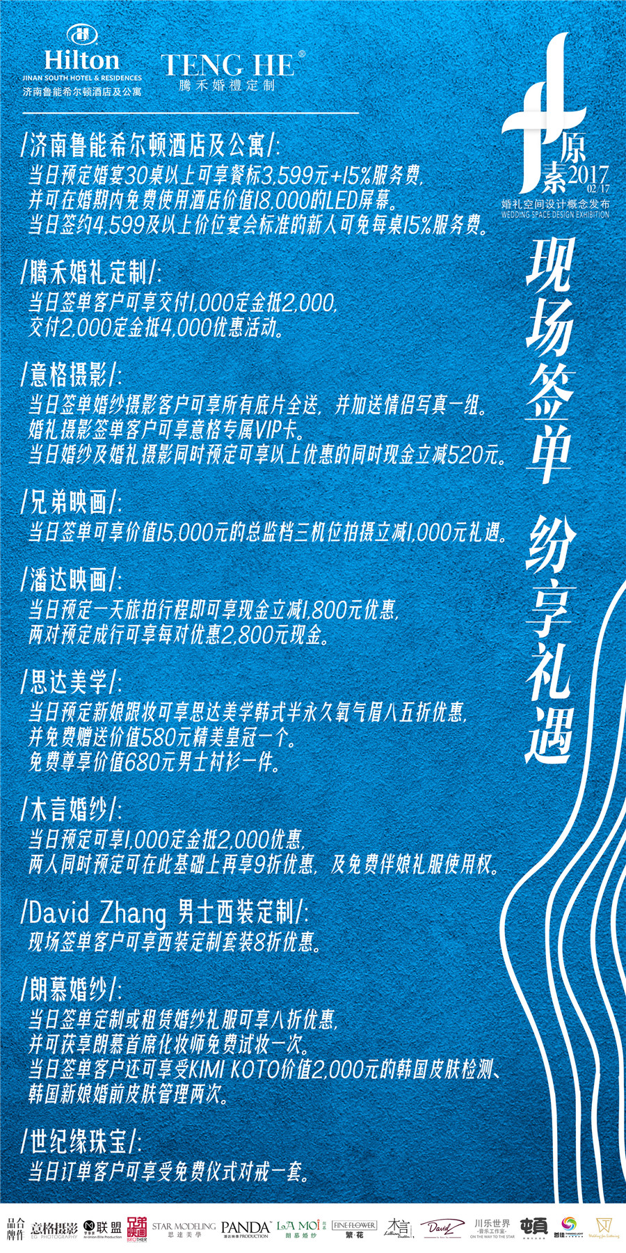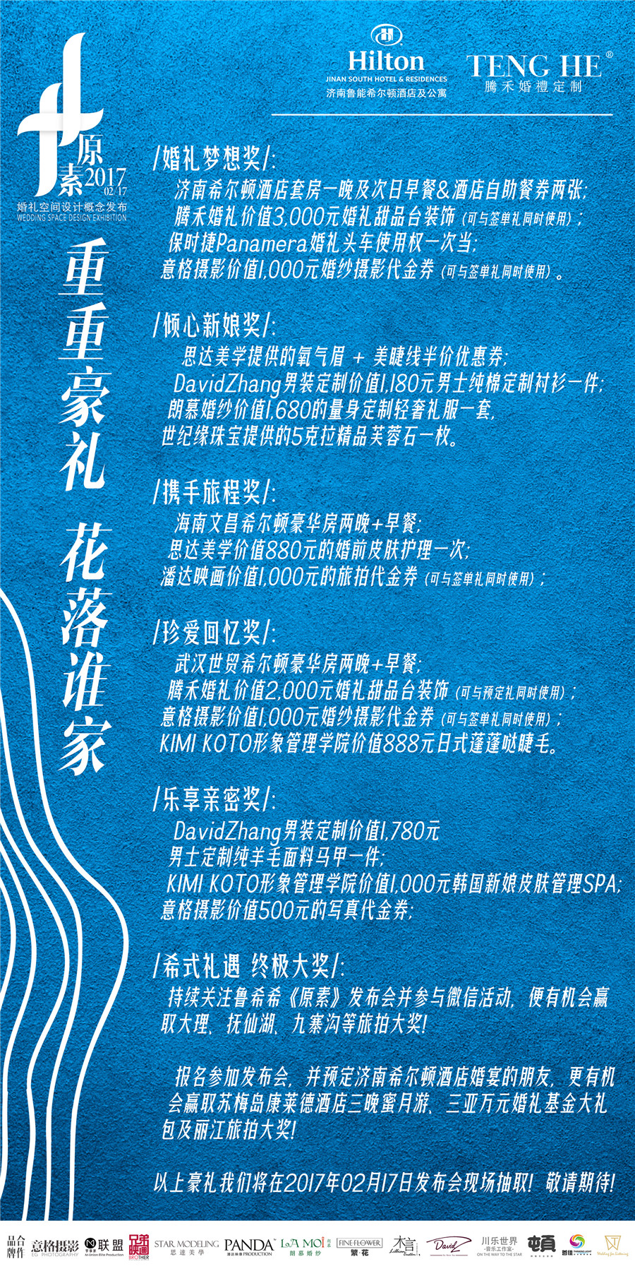 2017腾禾婚礼定制开年首秀《元素》携手希尔顿酒店,2月17晚邀您品鉴!你的婚礼,由品质商家们为您共同打造,全新婚礼概念,全能优惠套餐,美景美食,大奖大礼,限量100对品质新人优选报名,开年视觉盛宴等你哦!