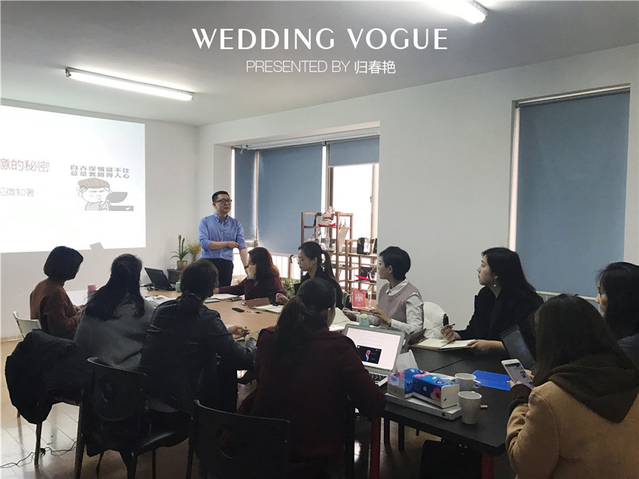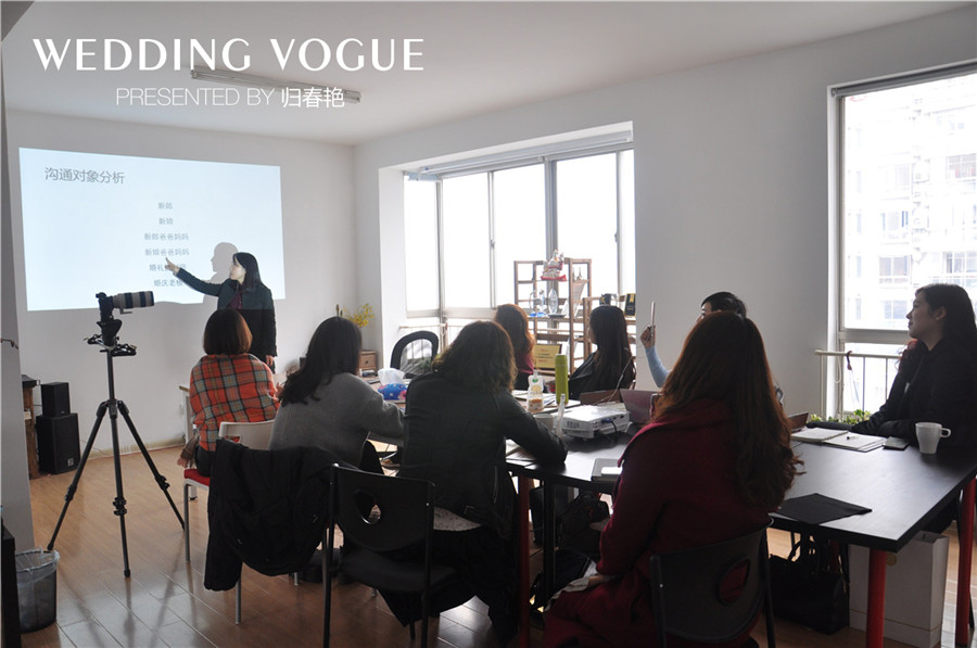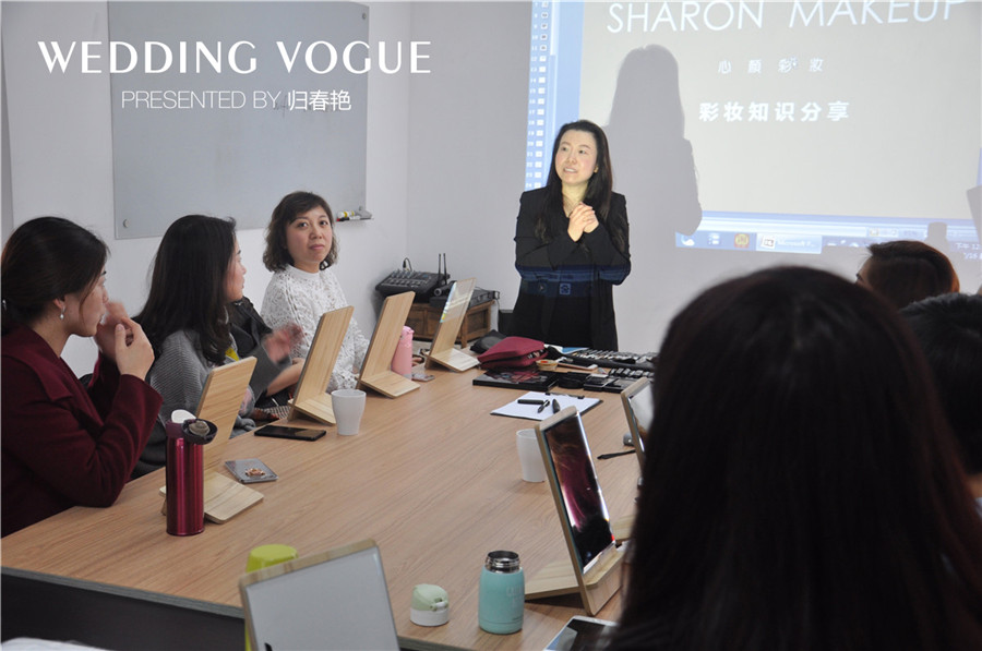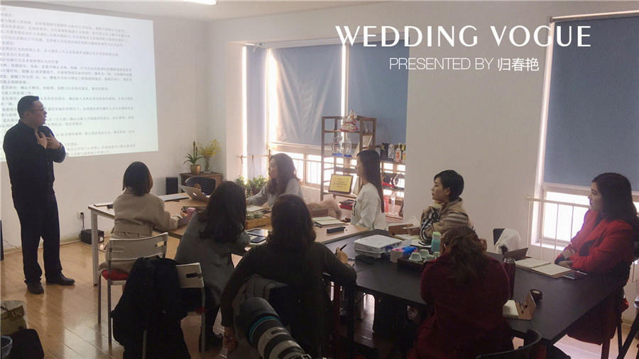 专业细分,储备知识。由海霞老师讲课解析主持人职业妆容与新娘晚装的不同,让主持人充满自信。Topbridal品牌试纱进一步让学员们理解婚纱礼服的意义,美源于自信心。