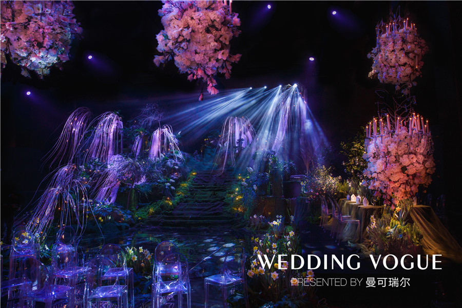 本场婚礼秀以水的轨迹来表达爱情。爱情像动态的水,也就是这场婚礼秀布置中的主背景——瀑布。瀑布极具生命力,拥有无限的可能性,如同爱情中热恋的状态。
