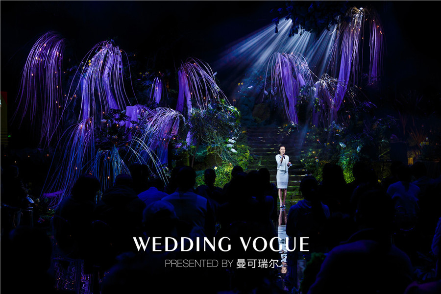 此次婚礼秀的主题为“花重锦官城”,古韵十足的名字,可能让人以为这是一场中式风格的婚礼秀,或者一场以花为元素的婚礼秀。曼可瑞尔设计师小章鱼在婚礼秀现场给来宾阐释了设计理念。她说,这场婚礼秀更多的是借用“水”这个元素来表达“花重锦官城”。