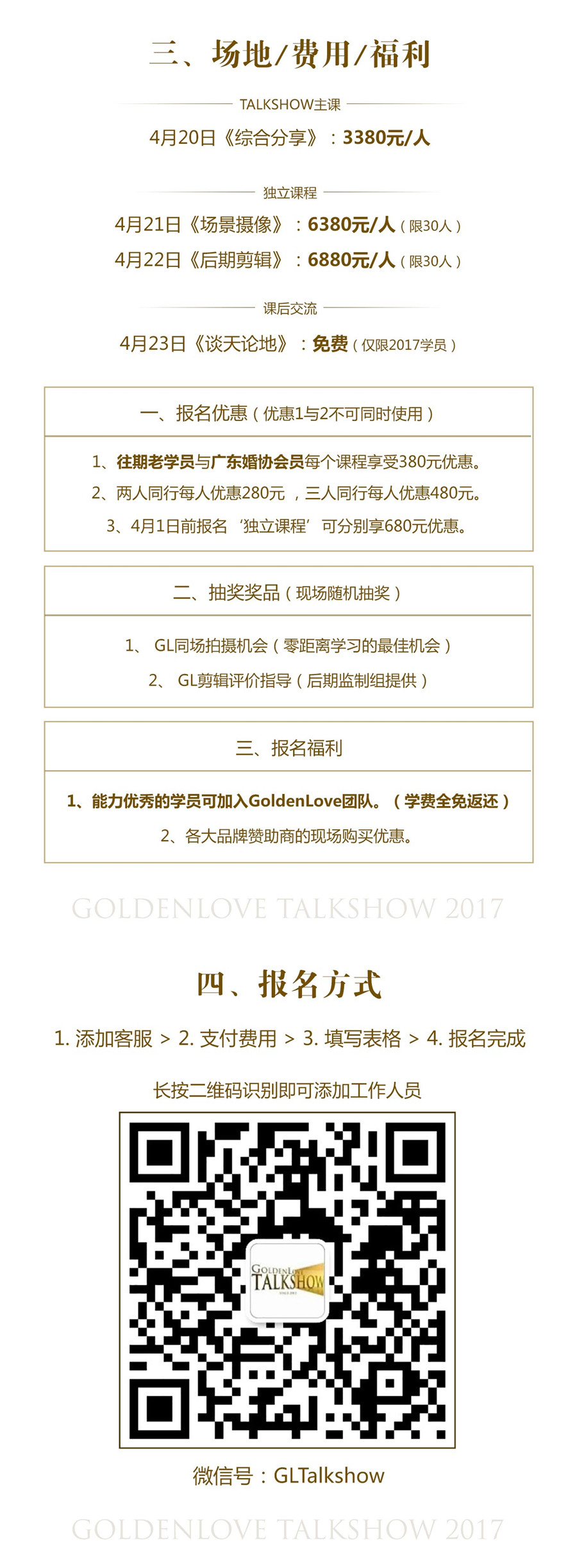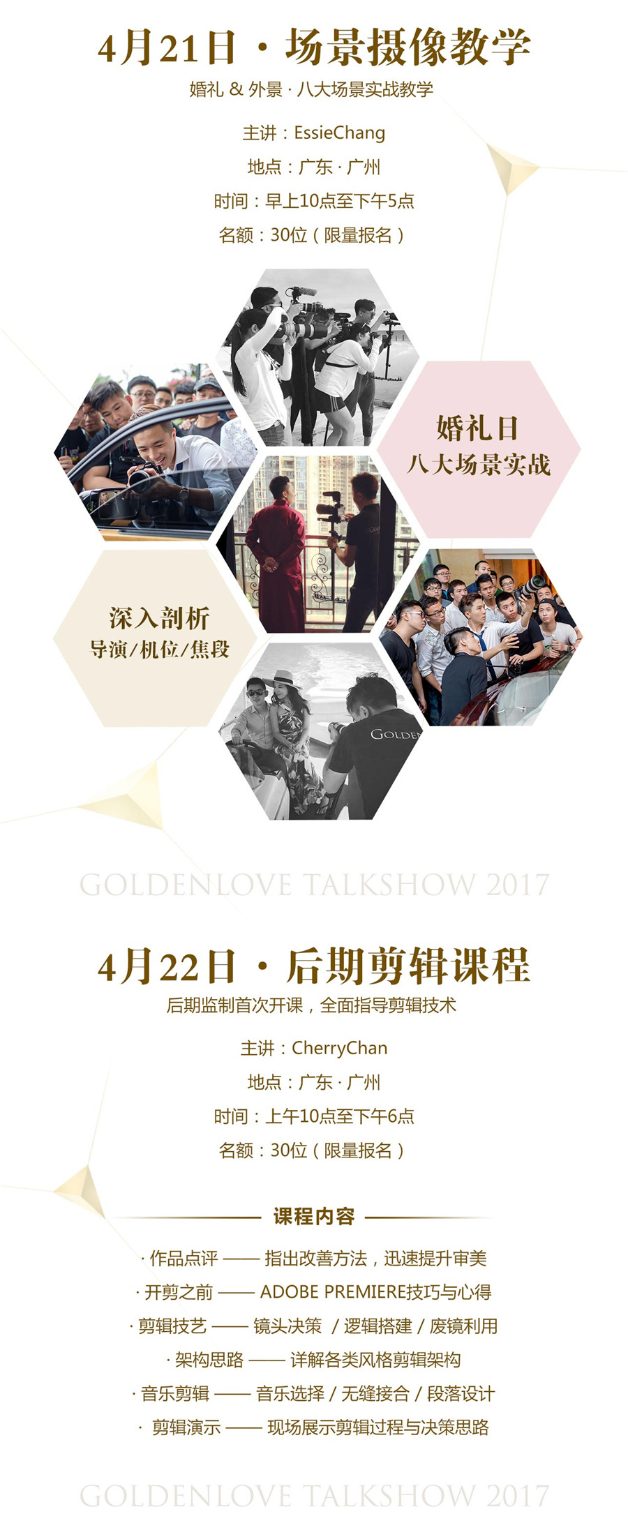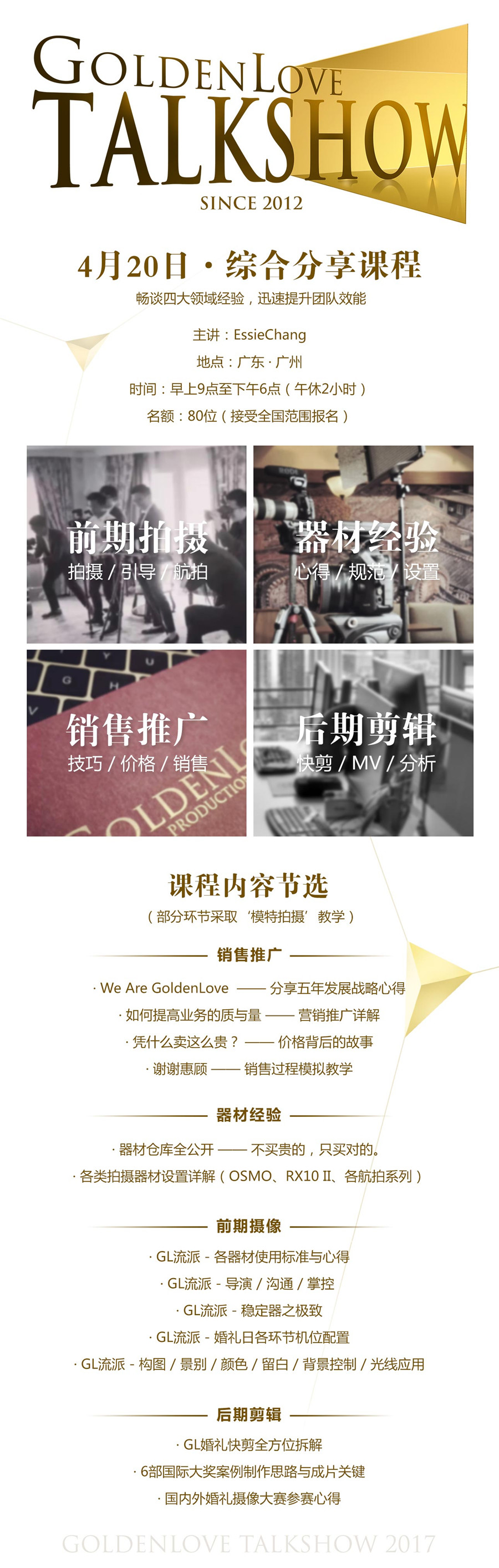 GoldenLove Talkshow 2017 四月课程 · 正式开放报名!课程内容有前期拍摄、器材经验、销售推广及后期剪辑,八大场景实战拍摄训练,6部国际大奖案例制作思路与成片关键等等!干货满满!等你来战!