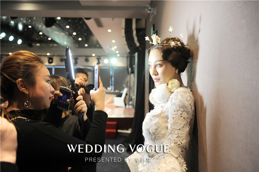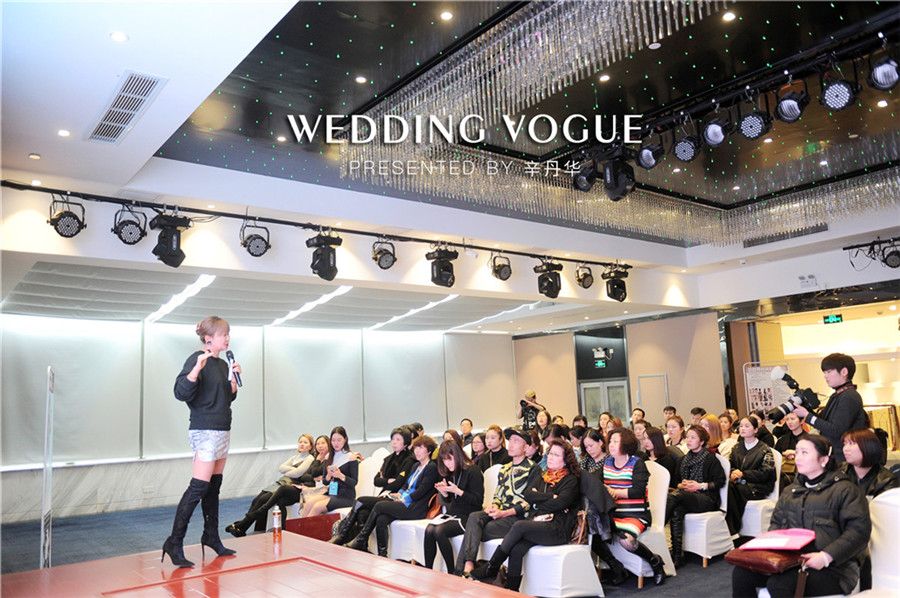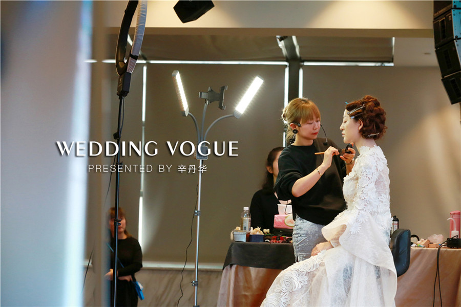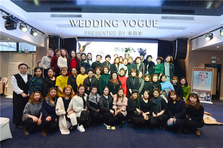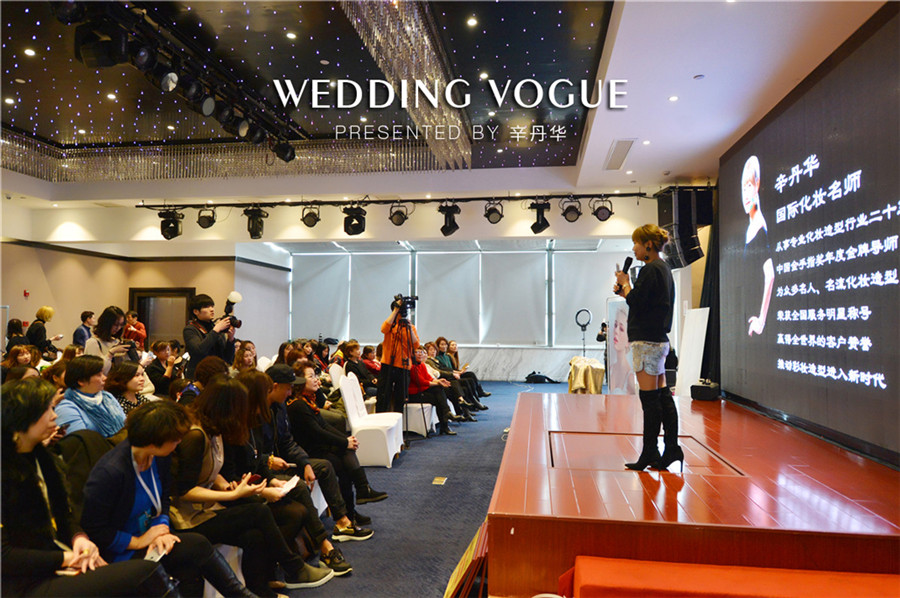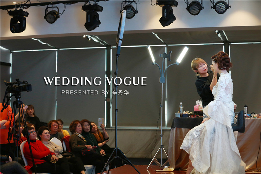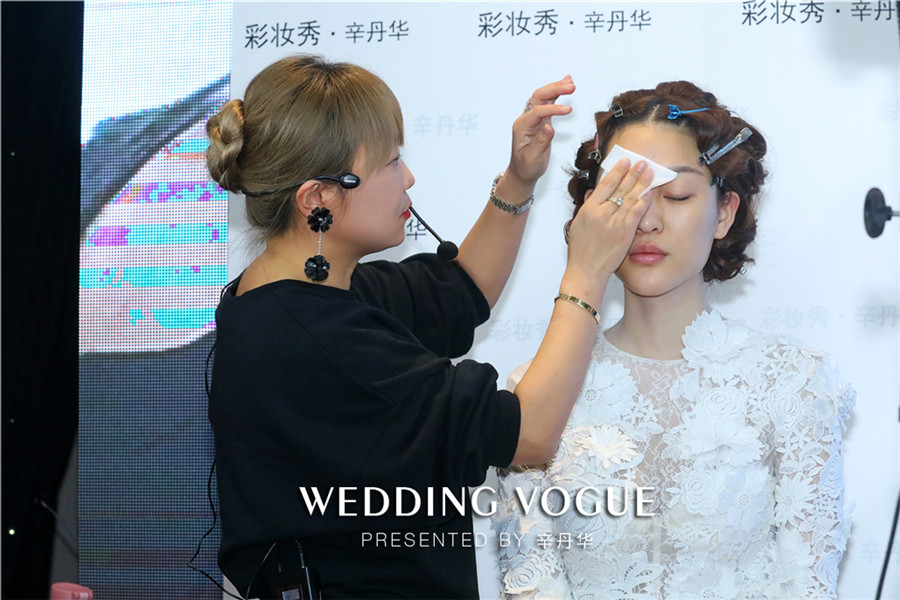 辛丹华服务过众多明星名人,其中有金志文、赵若虹、袁成杰、夏磊等名人婚礼。辛丹华结合自身经验出发,谈到婚礼不是秀场,新人在婚礼当天,与亲朋好友面对面,现场是没有可能PS的,必须现场看到就是美的。所以新娘妆容强调无粉痕迹,透明的底妆,眼妆真实自然,强调脸部轮廓,尽量把皮肤做到有光泽,做出明亮感,彰显气质。针对每个步骤做出亲自一步步示范,大家受益匪浅。