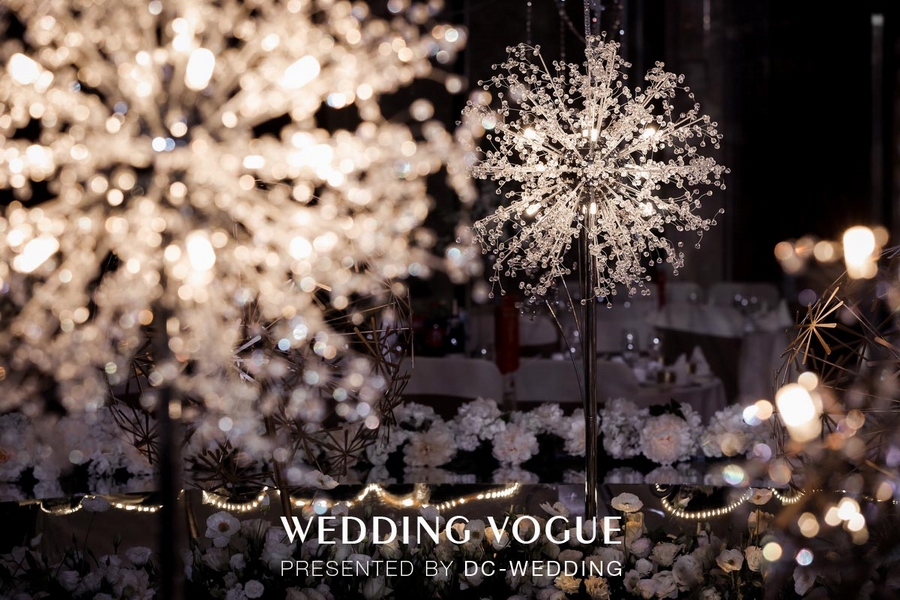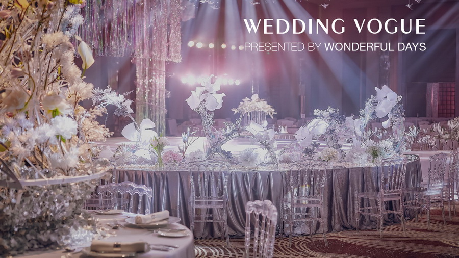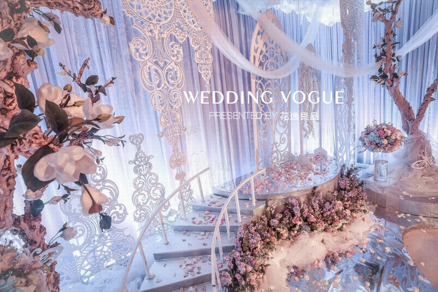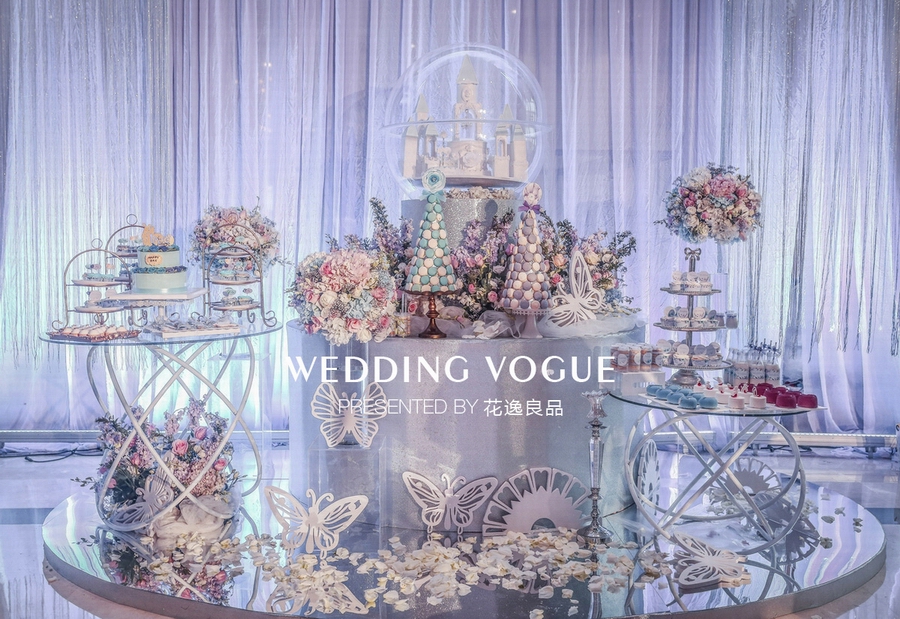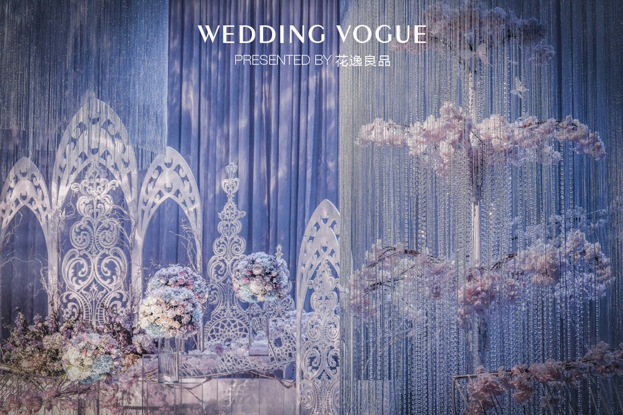 一簇浪漫紫,一段长情诗。婚礼现场仿若丁香幻境,一簇簇紫萦绕在城堡周围,被流光般的珠帘染上。柔光散射,空气中遍布着带紫的浪漫因子。