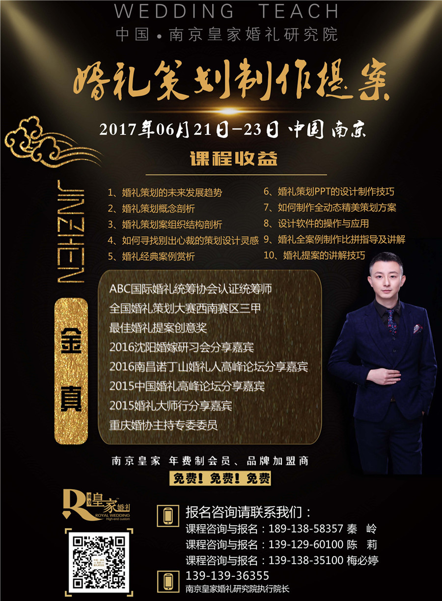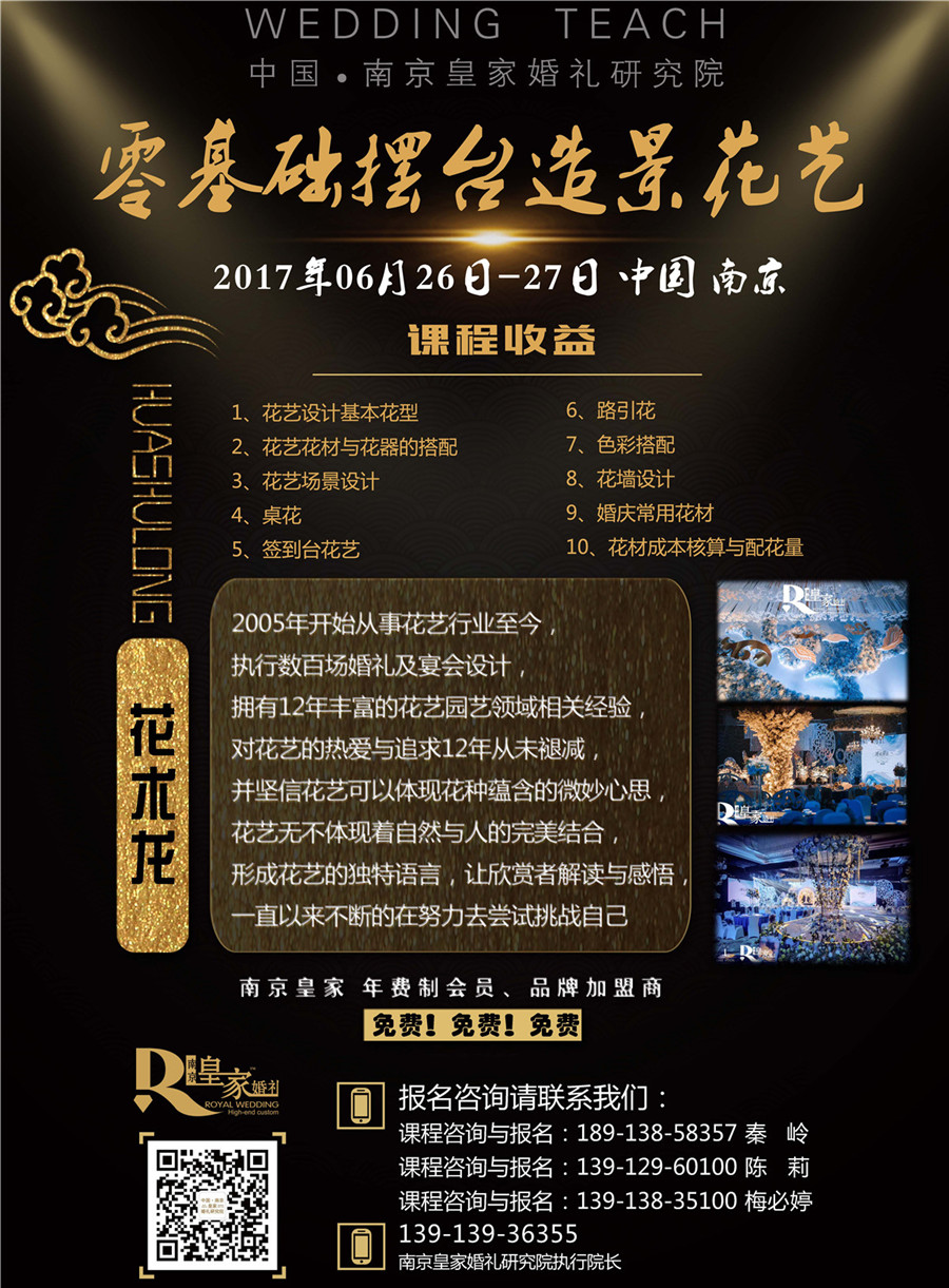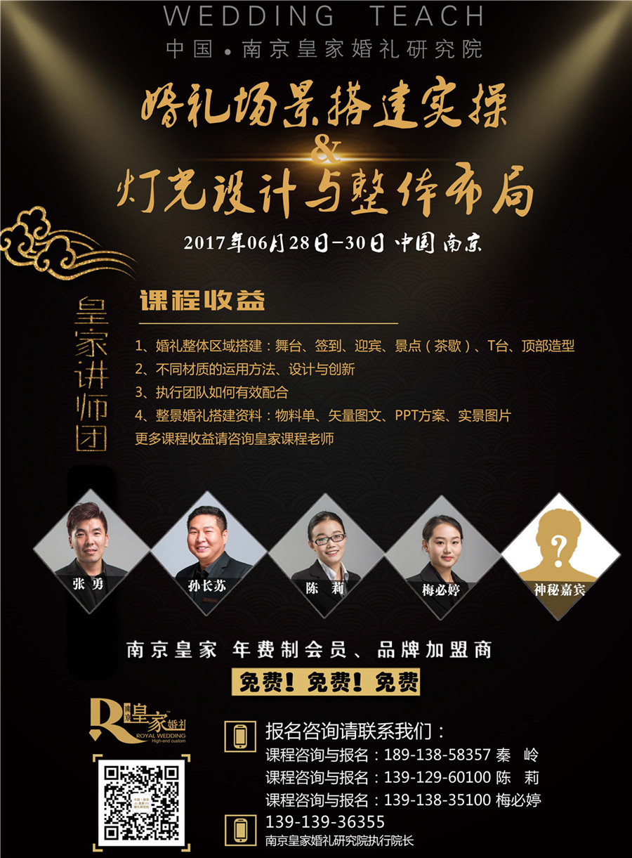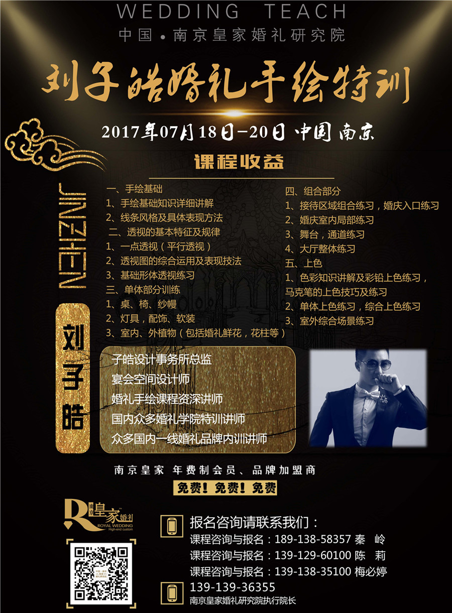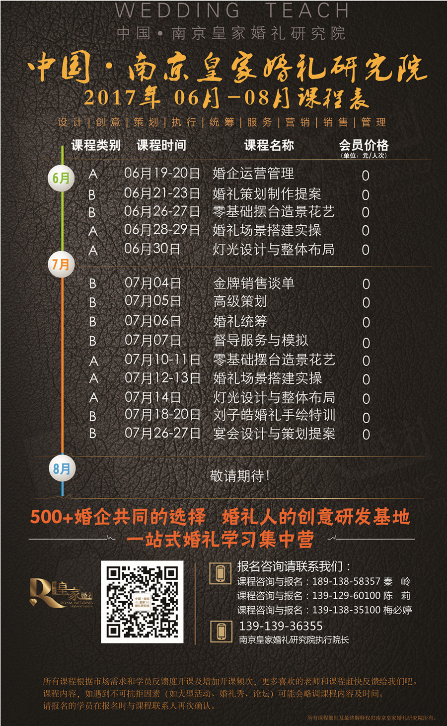 备注:课程内容,如遇到不可抗拒因素(如大型活动、婚礼秀、论坛)可能会略调课程内容及时间。请报名的学员在报名时与课程联系人再次确认。