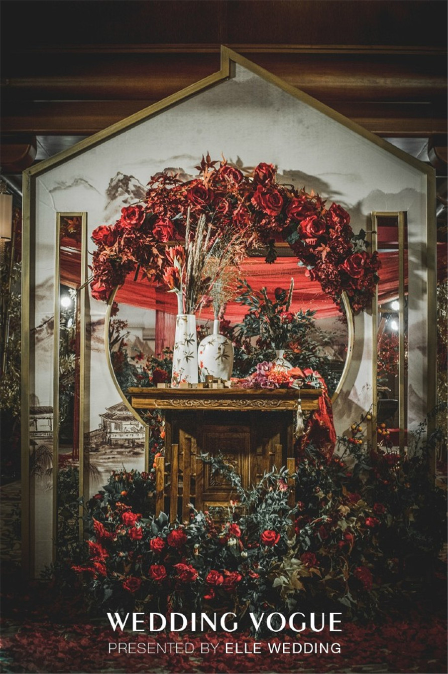 借用了沧海及明月加入屏风,木质的仪式背景,刺绣蝴蝶装饰,中式玉兰花艺。