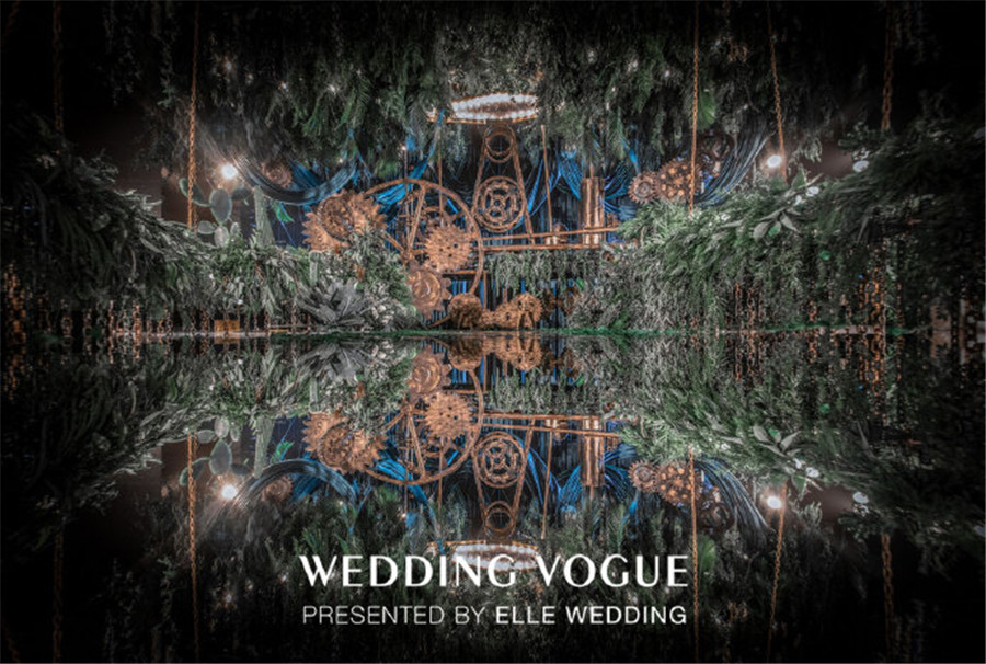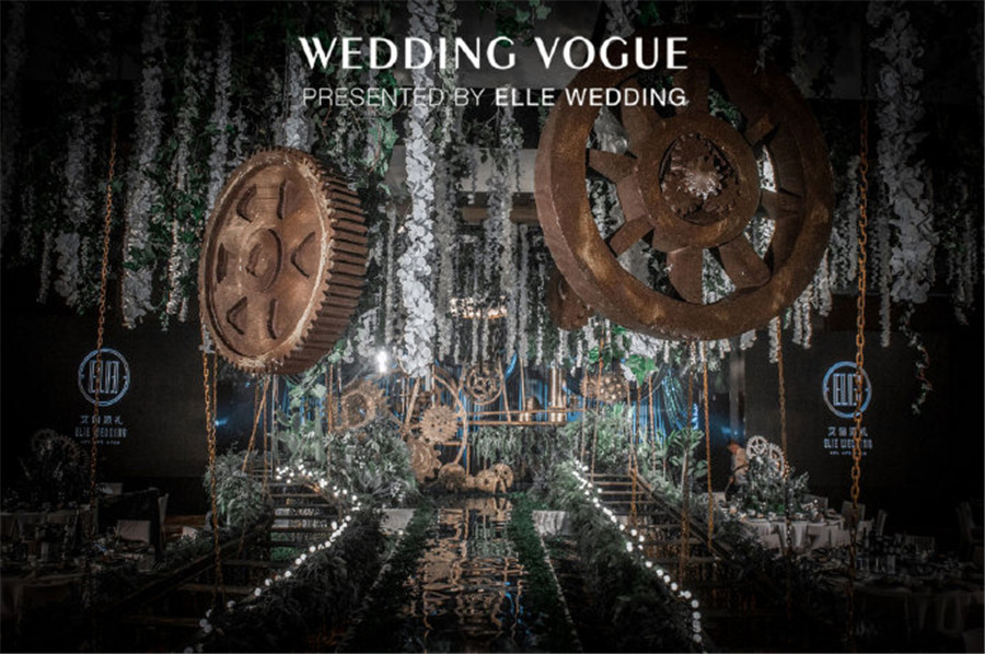 从仪式区以巨大的齿轮元素为舞台主要元素,加入铁艺的质感,以及顶部森系叶子装饰,两侧加入大型仙人掌。狂野又冷静的色彩混合了诗意与智性,卓越与精确,魔幻丛林主题婚礼布置。