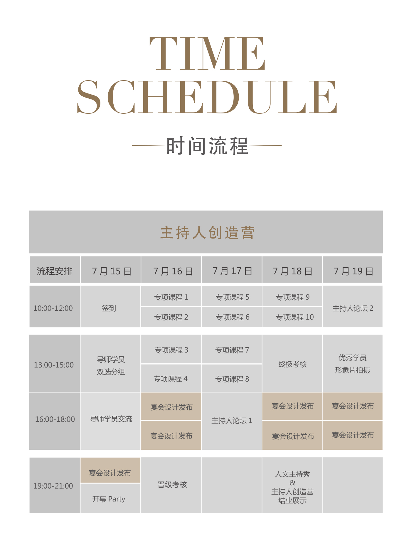 婚礼行业大咖主持人小班指导,给自己一个与导师深度交流的机会。主持人创造营期间,导师将与教练共同完成对学员的课程教学,并指导学员完成考核任务,帮助学员面向国内优质婚礼机构与婚礼人展示自己。