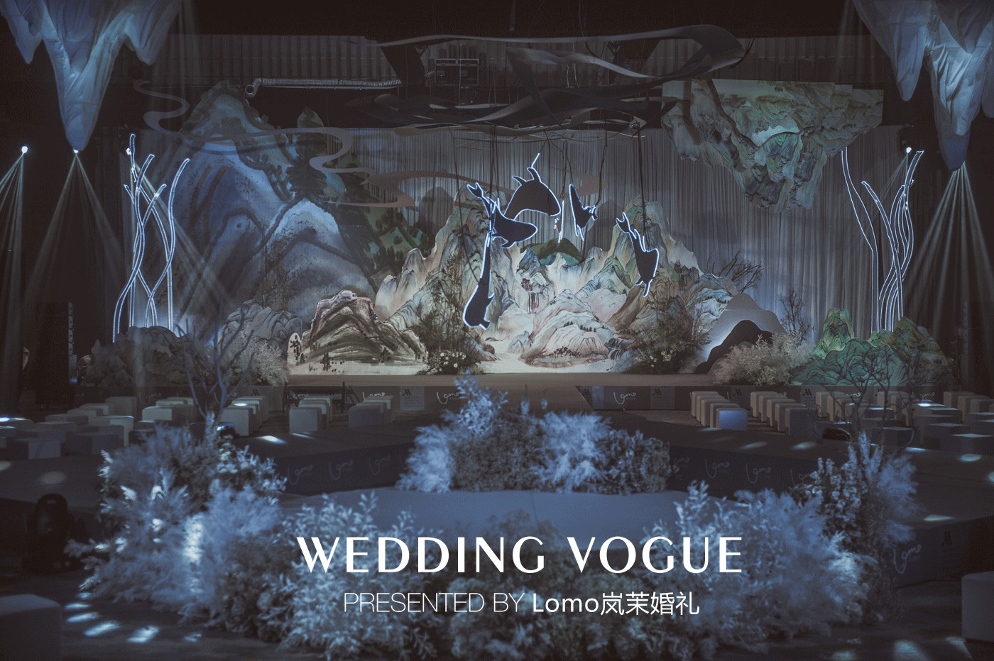 为了打造古朴神圣的感觉,Lomo岚茉婚礼选择用一曲古典乐曲进行开场,同时两个副舞台依次亮起,头顶上倒垂的青峰,倾泻而下浓浓的水雾,整个现场宛若仙境。