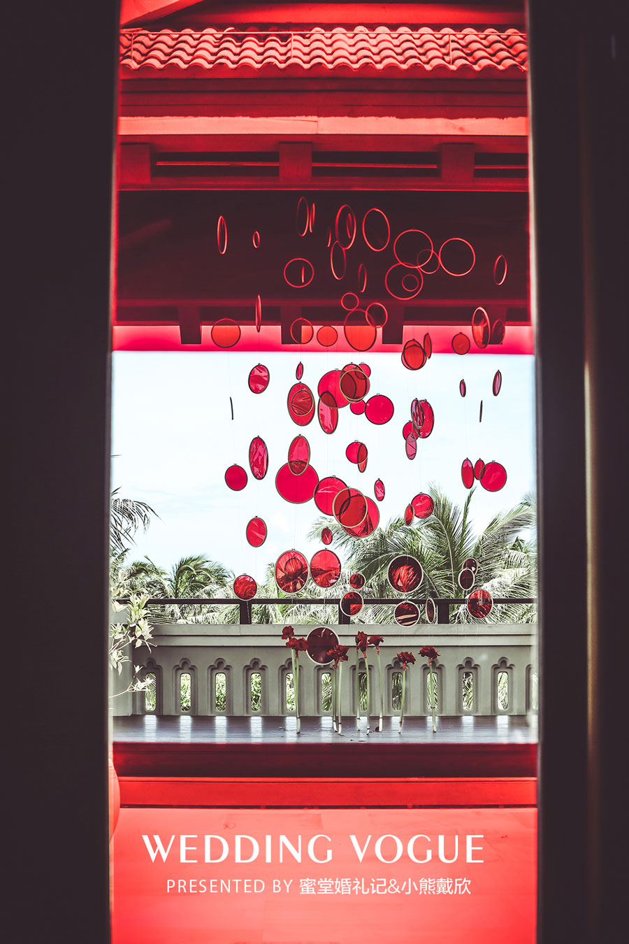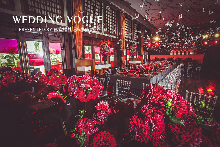 曾在三亚诸多酒店做过大型婚礼宴会的小熊老师,这次利用餐厅天花板原本的吊顶悬挂千纸鹤;餐桌重新排列,搭配桌布、桌花、餐具、餐椅,组成西式宴会的格局;落地玻璃门搭配红色半透明贴纸,与室内环境呼应;餐厅外的露台凉亭也做了布置,可作为仪式区,走出观赏亦可感受同样的惊喜。