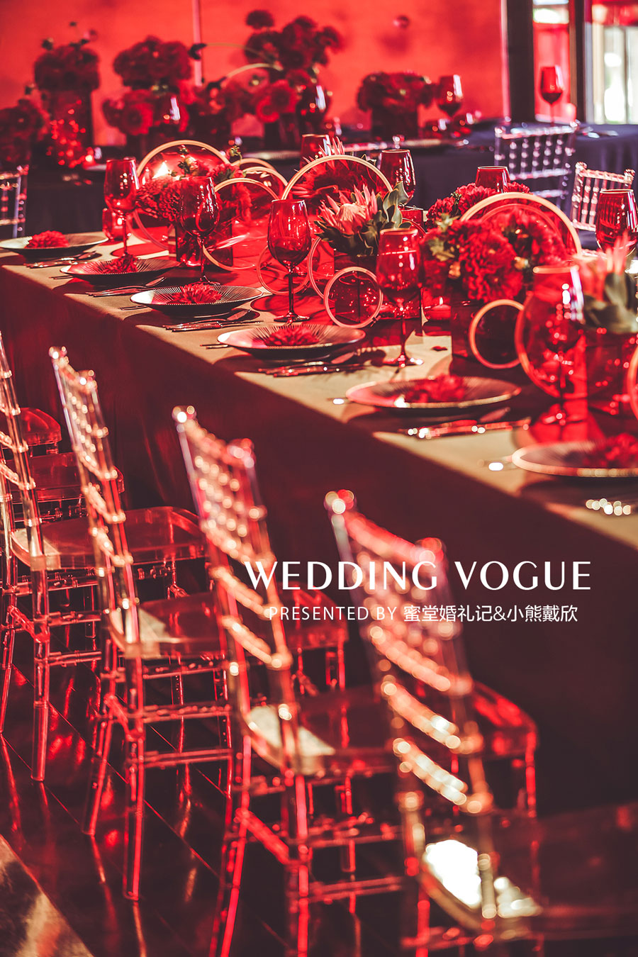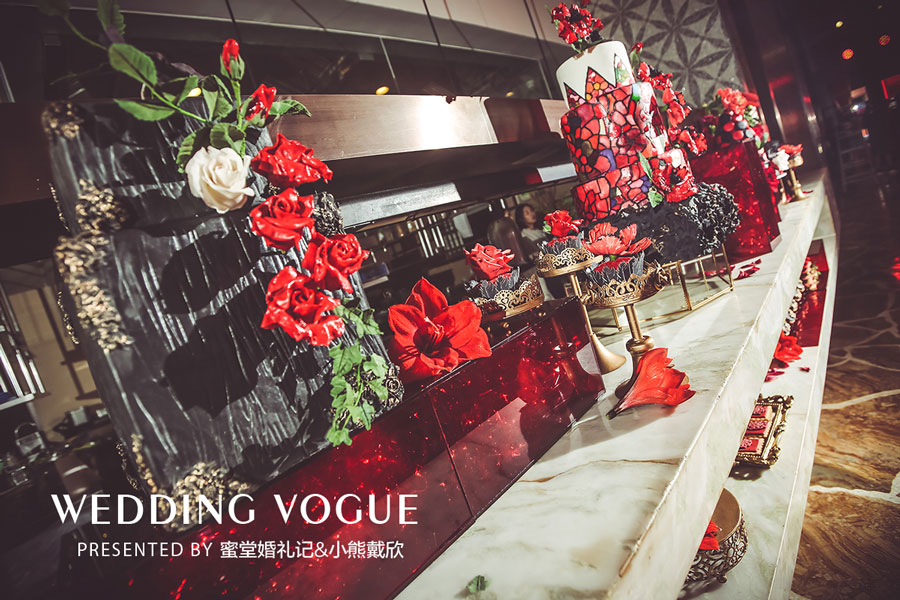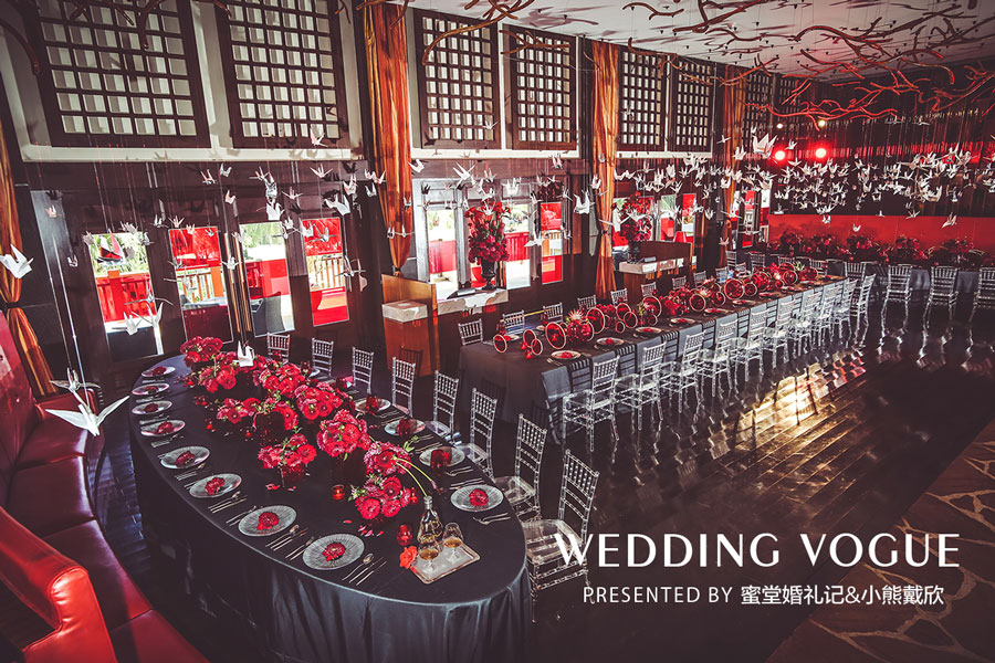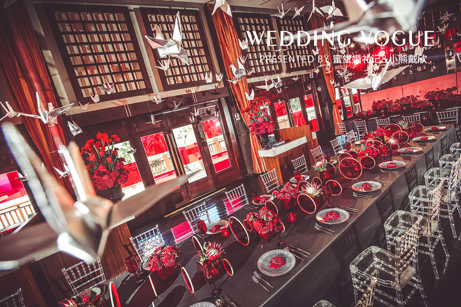 伴随着电影《教父》中的一首意大利配乐走入餐厅,映入眼帘的是满眼的红与黑的室内布置:门口的迎宾台上摆放了各种类别的大红色花朵,餐厅两侧的落地玻璃窗被贴上了红色的透明贴片;精心布置的西式长桌上,黑色桌布,红色桌花,精致的银色餐具和透明竹节椅;而在餐桌的上空,上百只白色千纸鹤悬挂在空中,随着微风轻轻浮动。