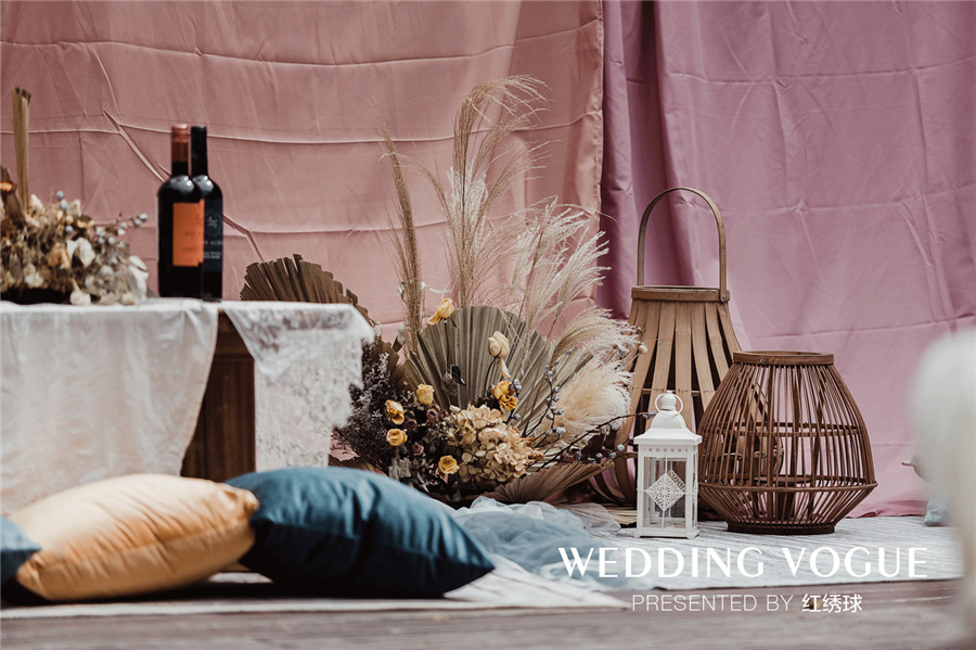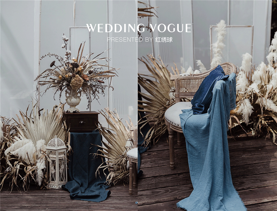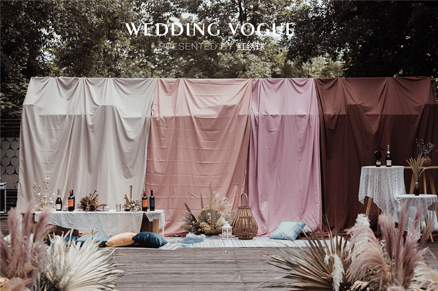 雨后,阳光尚未完全洒落。微风拂来,芦苇微微摇曳。轻如蝉翼的纱,随风飘扬的裙摆,在户外布置中更加仙气十足。