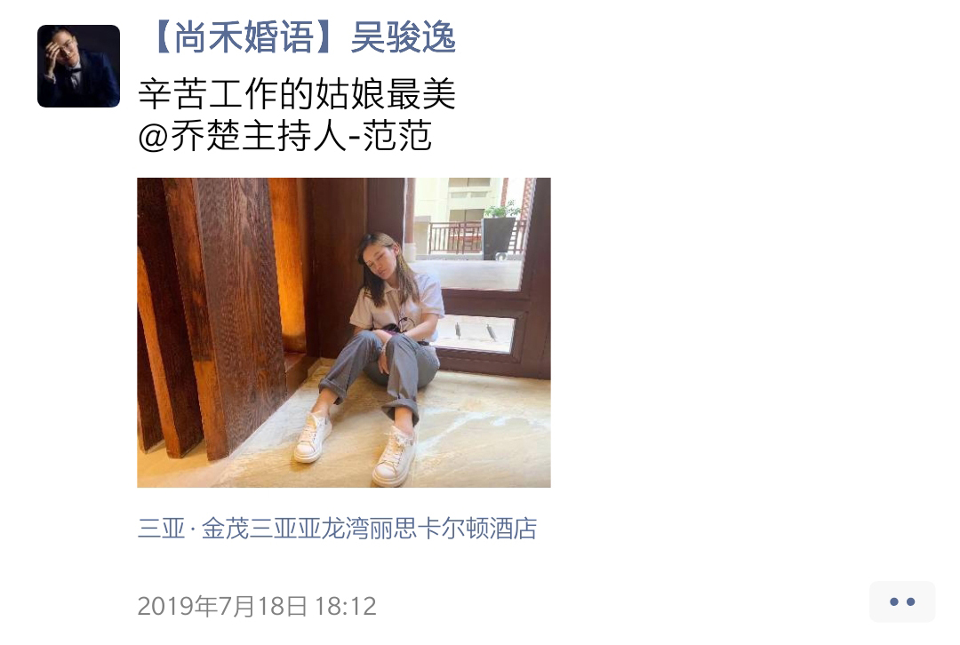 7月18日 尚禾婚语创始人吴骏逸在朋友圈中写道“辛苦工作的姑娘最美”,图片中范范,在工作间隙坐在地上休息。