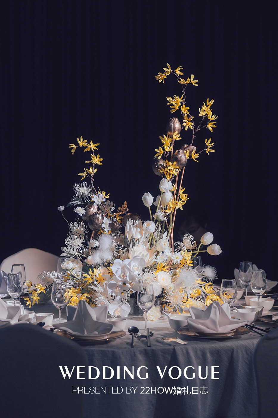 上古有四方神兽守护:东起青龙、西至白虎、北上玄武、南下朱雀。除了场景与内容设计,22HOW婚礼日志将东方美学插花融入西方桌花造型设计中,选取《山海经》中四方神兽,设计4款桌花。