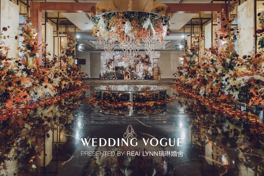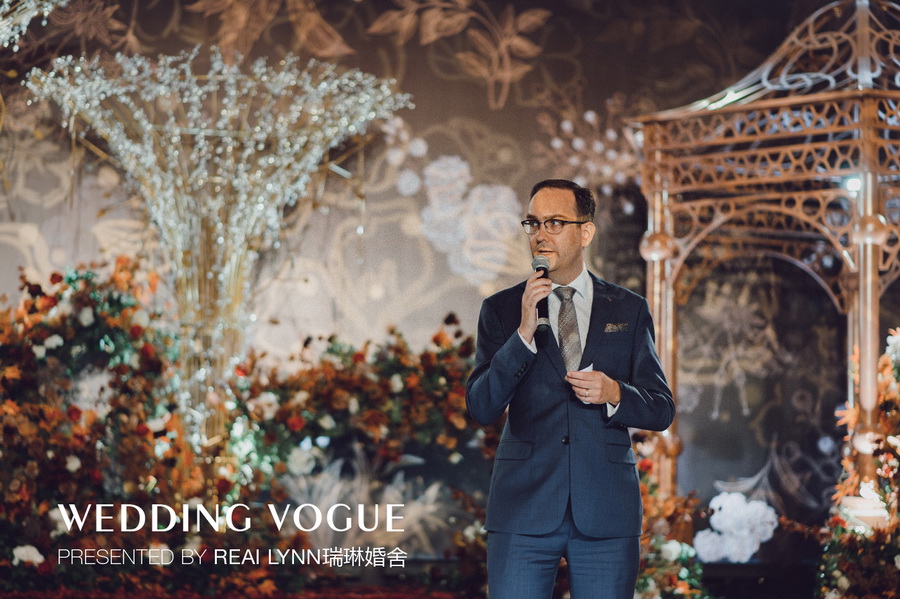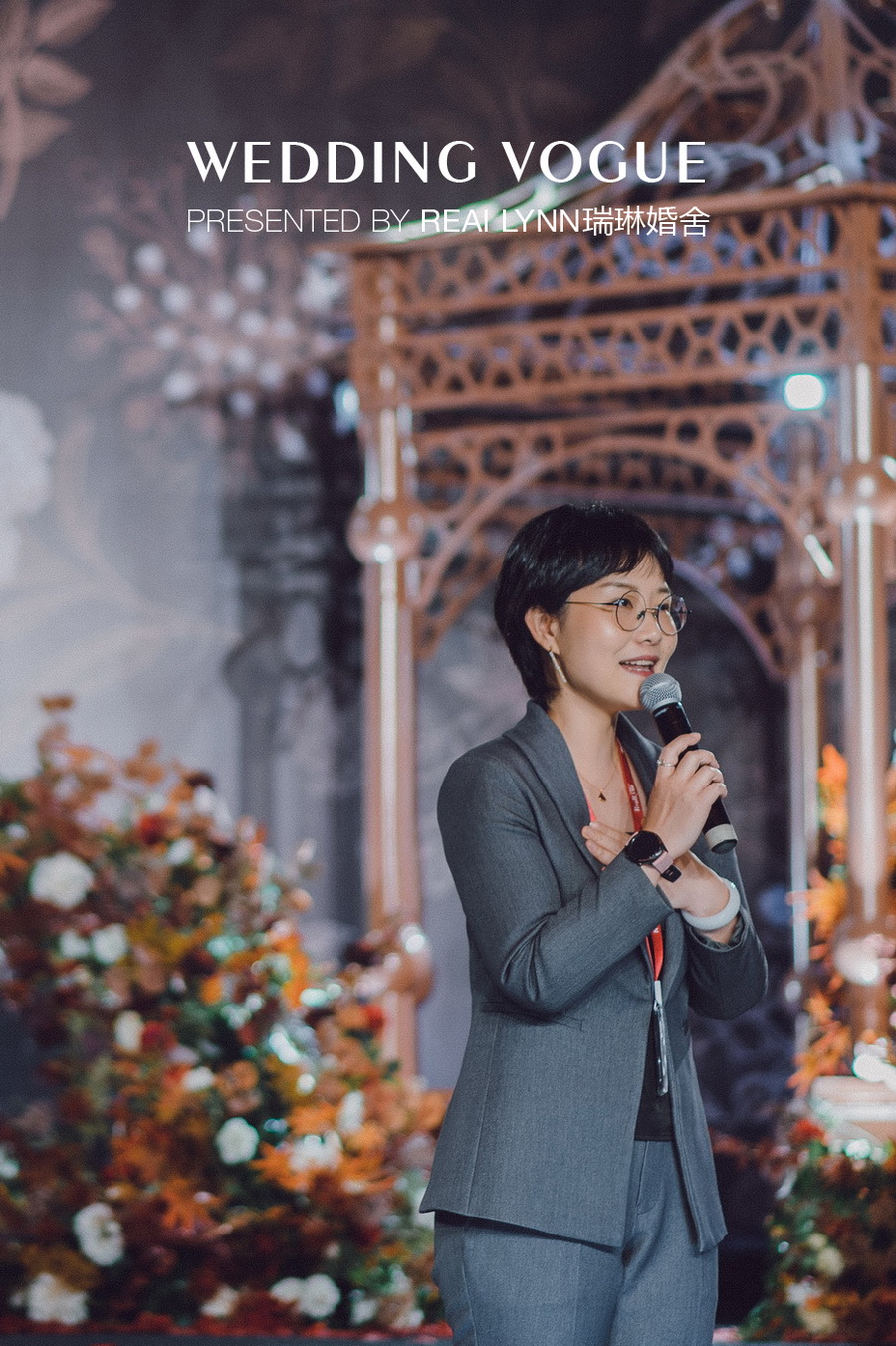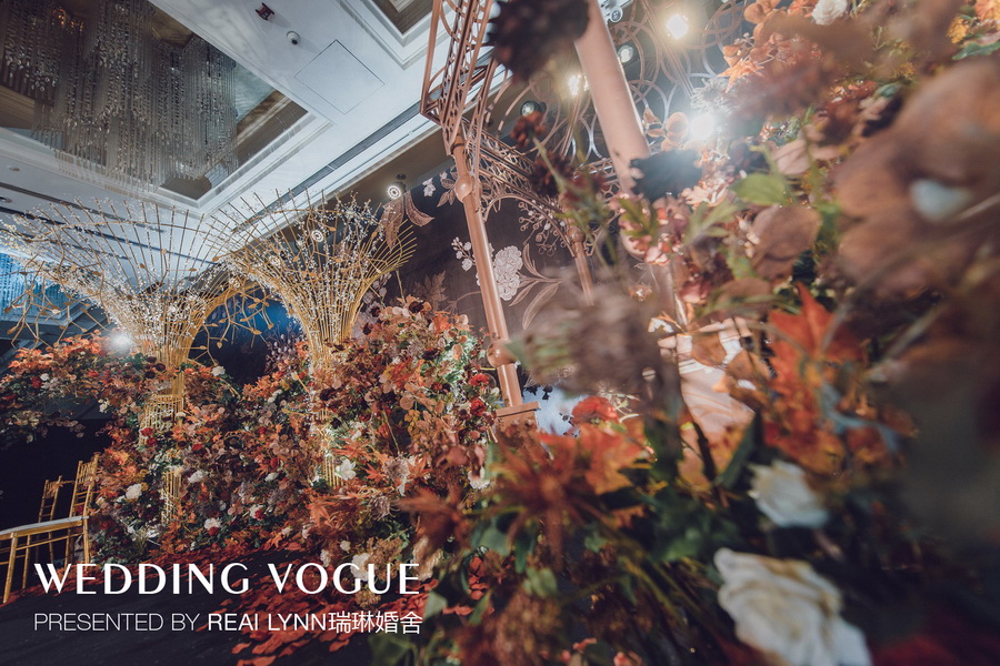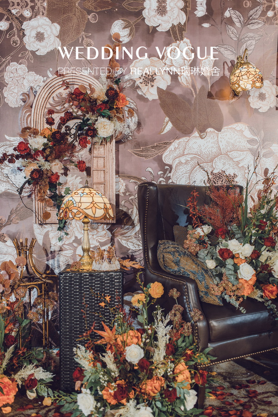 场地布置以颜色饱满张扬却不喧宾夺主的花艺为主,辅以木质的框架、线条,从入口的廊区,到空间开阔的迎宾处,一直延伸到宴会厅,宛若妖娆却不失温柔,妩媚中又流转羞涩的女子,默默含情的撩动所有来宾。