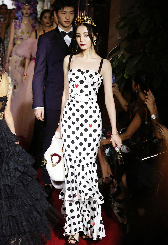 2018春夏米兰时装周,迪丽热巴作为杜嘉班纳唯一邀请中国女艺人与男模金大川一同走上杜嘉班纳首场高级女装礼服秀T台,热巴身穿黑白波点裙顶皇冠似小公主,浑身美到闪闪发光。