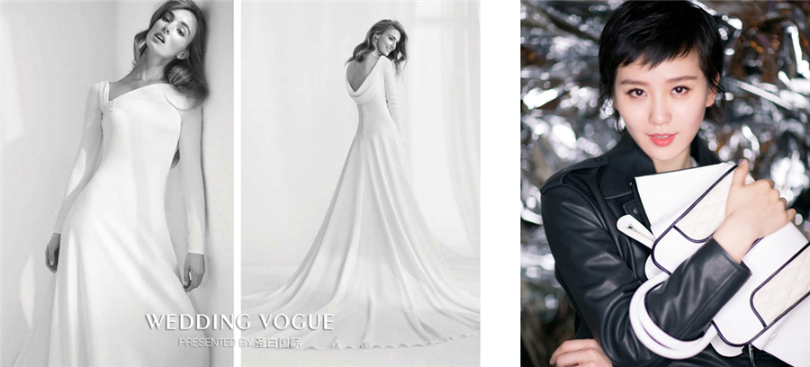 虽然早已穿过嫁衣,但为了配合现在诗诗短发帅气路线,我们为她挑选了线条简洁充满设计感的缎面婚纱,缎面的质感才能更加衬托出诗诗的高冷女王范儿。