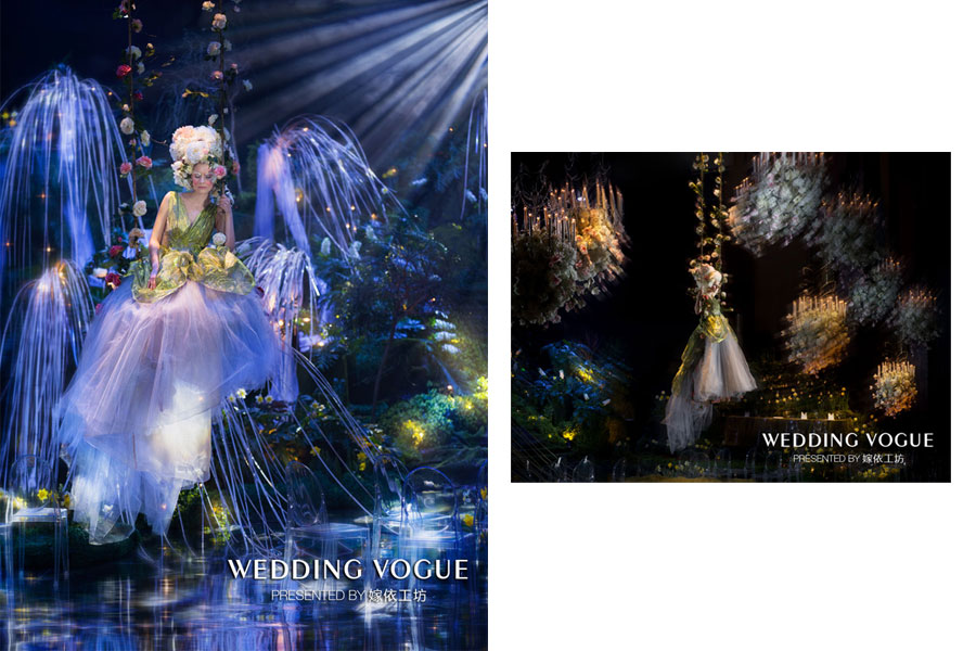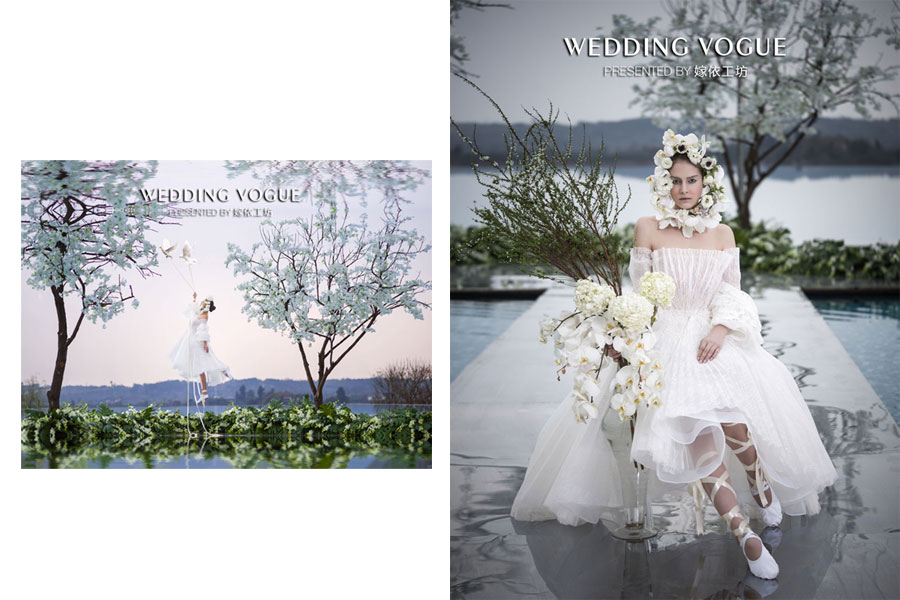 为了能够更好的结合大片主题“晓看红湿处,花重锦官城”的春之韵,嫁依工坊在礼服的表现上呈现了如百褶、泡袖、水波纹、镂空刺绣等轻盈的质地和明快的色彩等元素,以更精彩华丽的工艺,来赞颂春之美,褪去冬季的阴郁带来复苏的惊喜,且通过更深层次的灵感契合去表达主题。