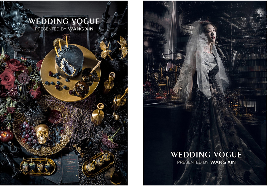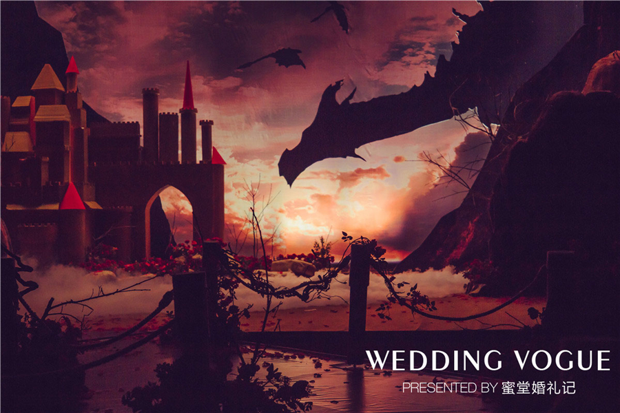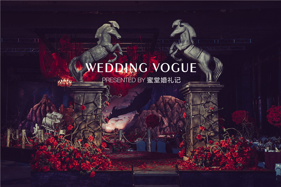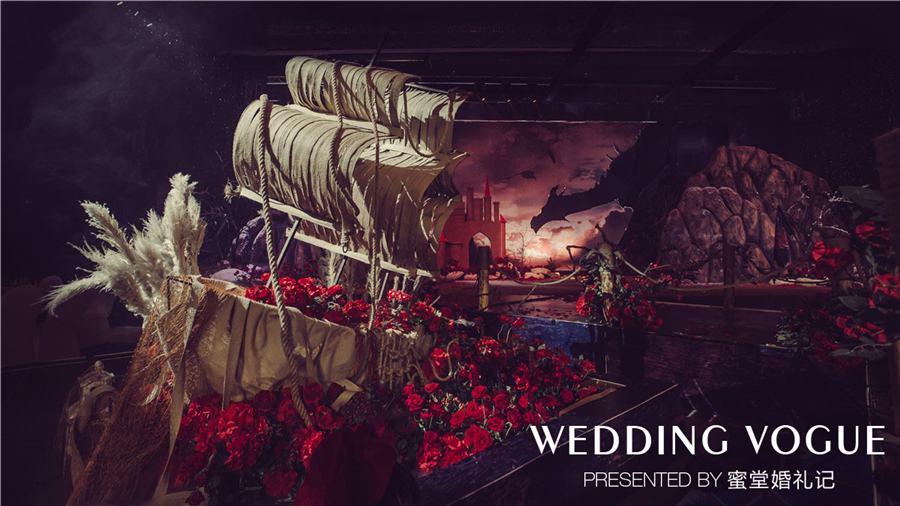 暗黑的色调,血红的玫瑰、金色的骷髅……这一场以吸血鬼为主题的布置,新人也身着哥特风格的服饰,化身不老不死的吸血鬼。没有丝毫腐朽的恐惧,而是一种从黑暗中涌动出爱的鲜活,一种对爱永恒的追逐。