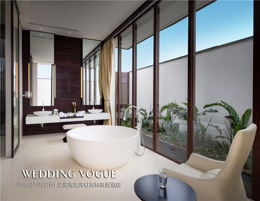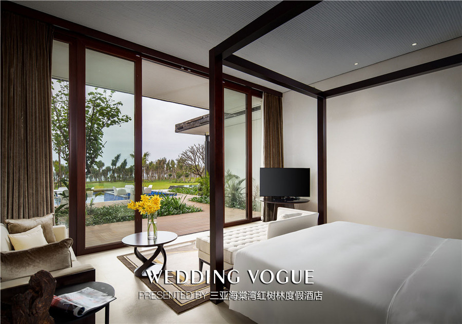海棠湾红树林酒店共拥有29栋临海别墅及大草坪,每间别墅均配有泳池,客厅,卧室以及阳台,完全满足客人在别墅举办婚礼的需求。在别墅草坪中,做一个关于爱情的梦,关于我们很长很长的未来,在这浪漫的气氛中,走完这意义非凡的长廊,从此,与你共度一生。