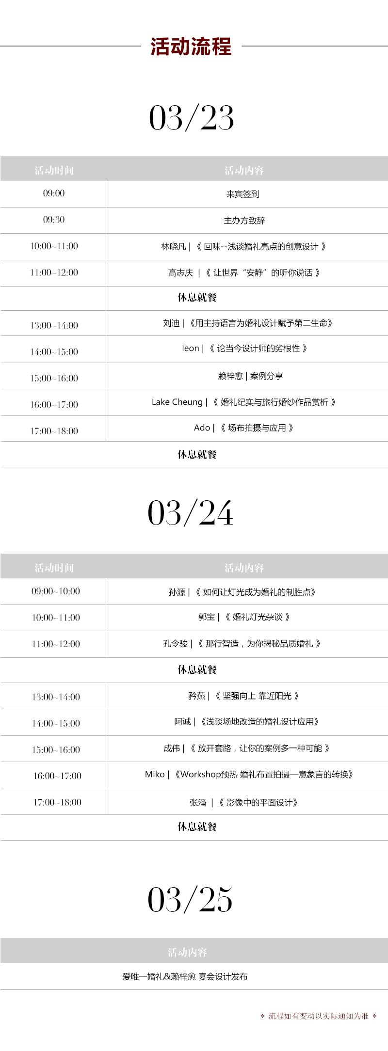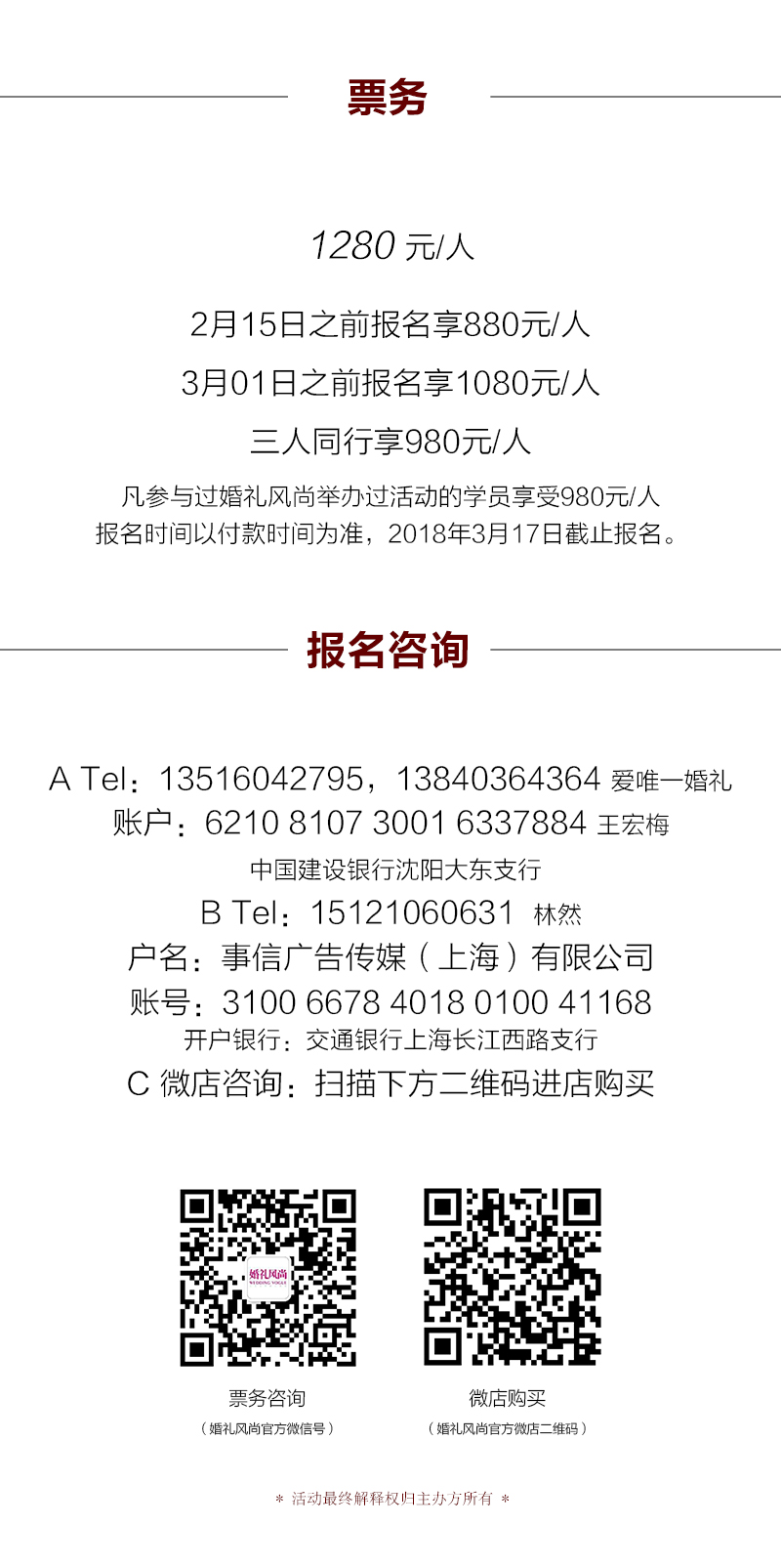 不仅特别邀请十多位婚礼行业全领域嘉宾一起同台切磋,更有南北婚礼设计品牌联合推出的2018年度开年大秀。这份精彩我们准备好了,但还在等你!
