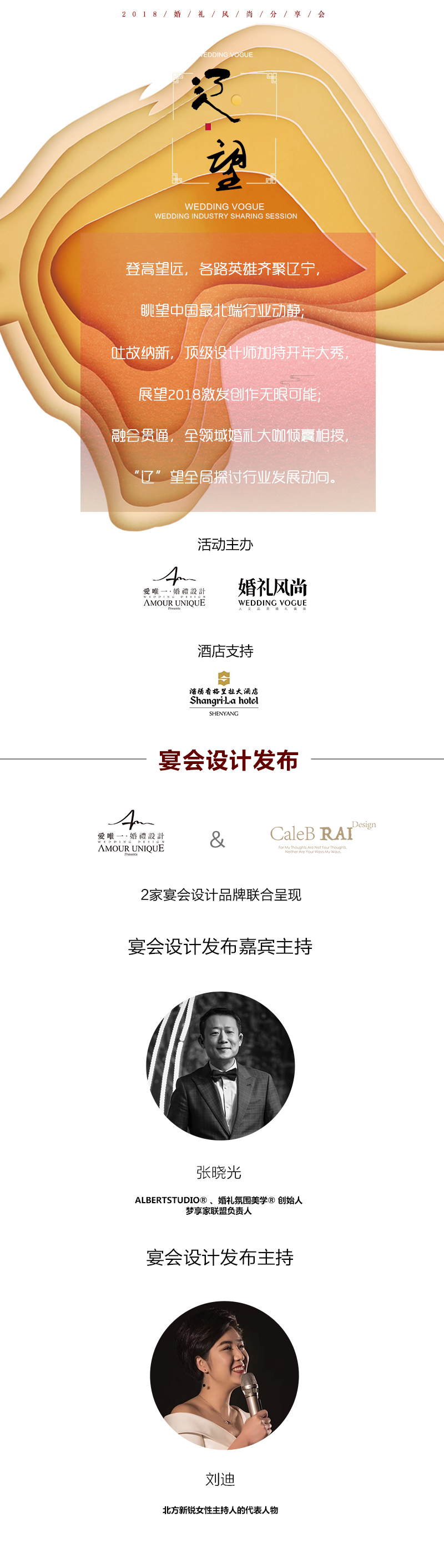 2018年3月23日—25日,婚礼风尚将携手爱唯一婚礼举办2018婚礼风尚辽宁分享会,“辽·望”中国东北婚礼动态。这是婚礼风尚于东北区域首个分享活动,我们满怀诚意,期待通过不一样的形式,激发中国婚礼行业的更多可能。