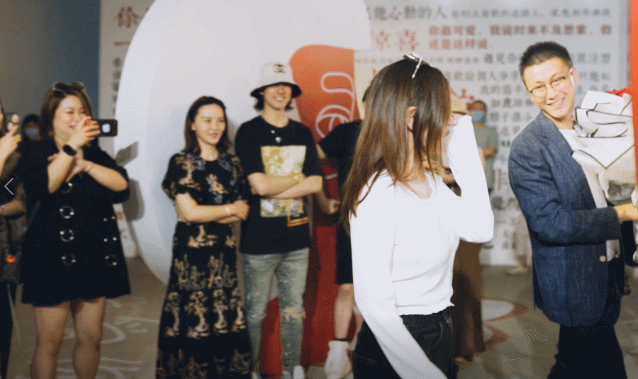 在观看视频的过程中,提前到达求婚现场一直躲在展板后面暗中观察的朋友们慢慢簇拥到了新娘身边,一开始投入于观看视频的新娘还以为身边都是一起看展的陌生人,结果一转头,发现都是他们的朋友们,还有特意从苏州赶来的闺蜜和妹妹。