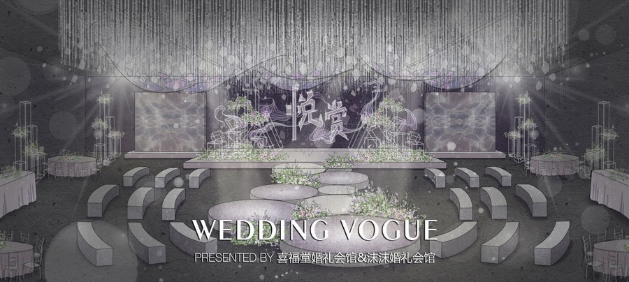 婚礼秀整场布置的主色调以高级灰为大基调,结合镜面,透明的材质为辅助材料装饰,点缀今年流行的紫色系。并且突出细节,与主题色相契合,灰色与紫色的结合,碰撞出极致的大雅。