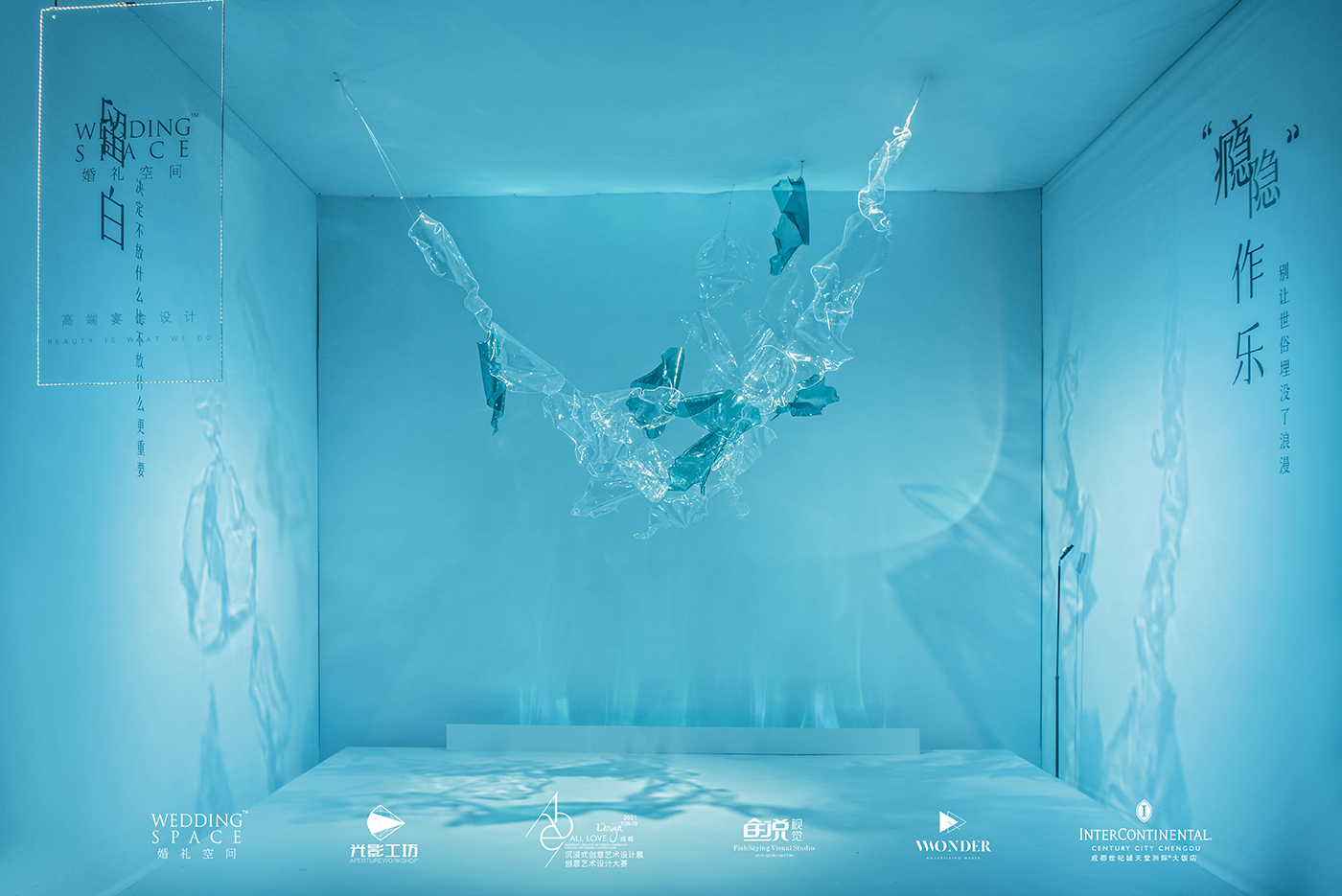 进入展区场,婚礼空间WeddingSpace设计师将至简宁静的白与沉郁神秘的蓝调和统一,以两种永恒经典的色调来诠释“留白”的概念。