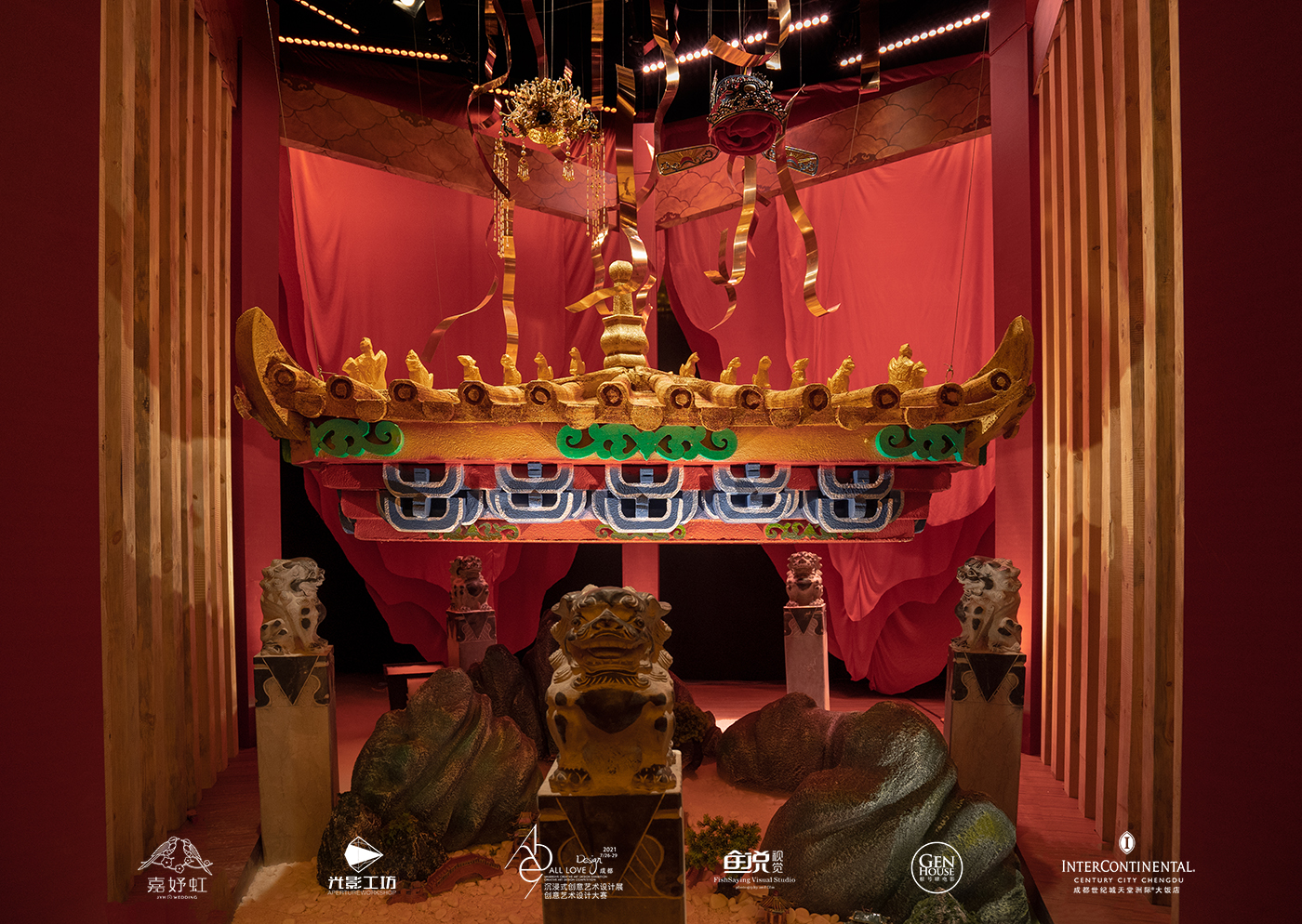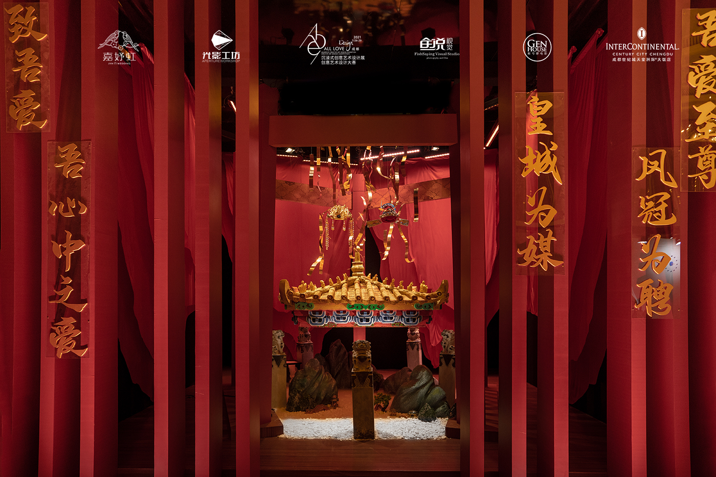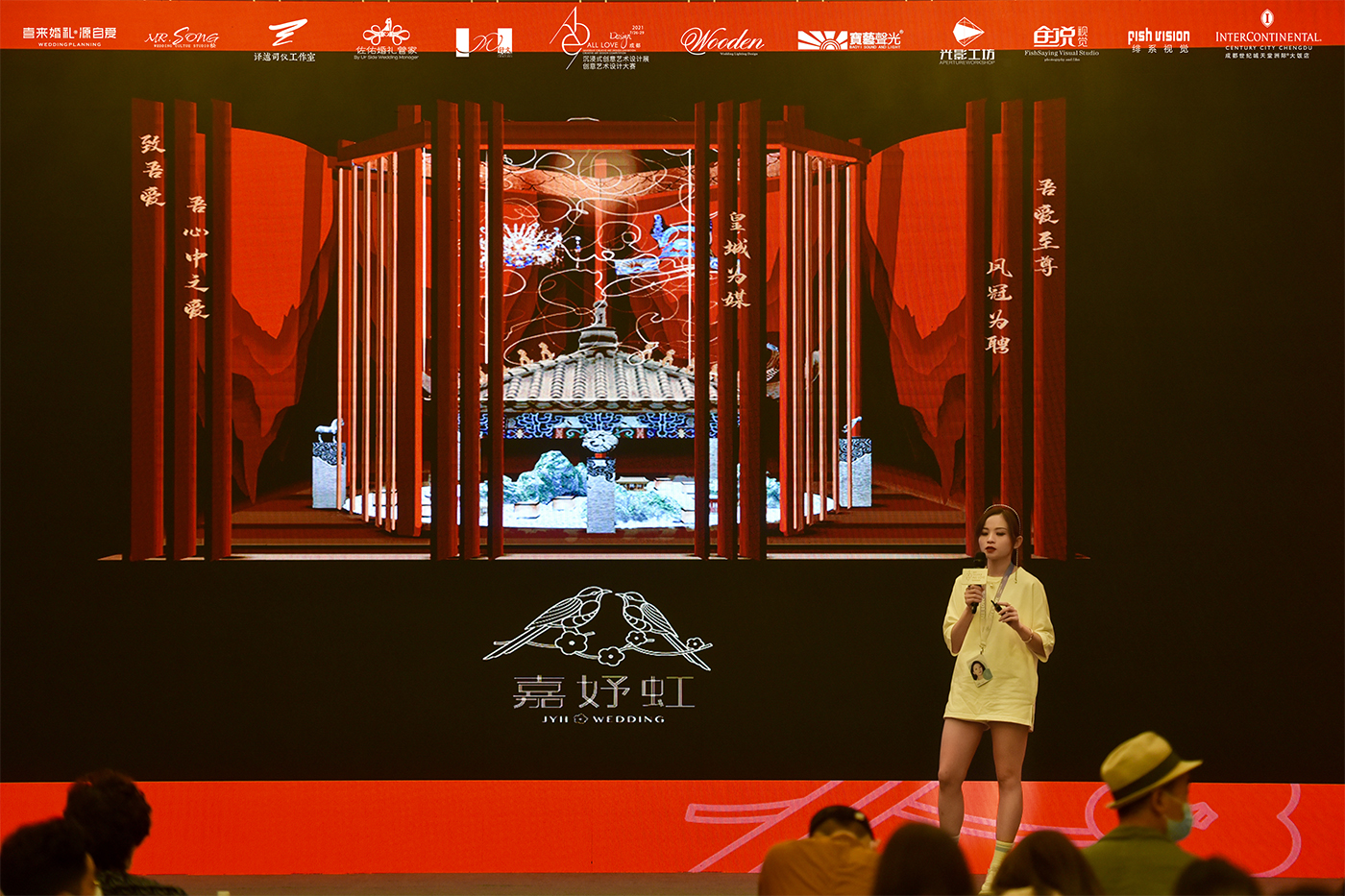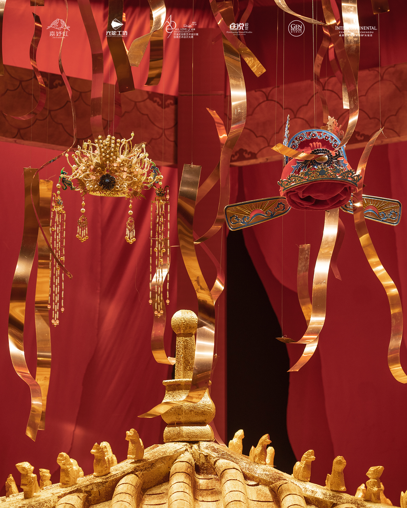 在此次设计展“致吾爱”的主题下,嘉妤虹婚礼以一场名为《皇城为媒 凤冠为聘 吾爱至尊》的“当门红”中式风格作品,为整个设计展展区增色不少。