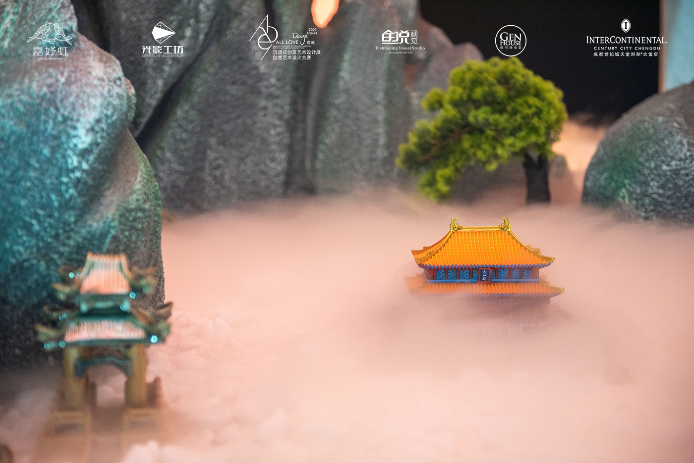 结合“致吾爱”的主题,此次设计作品融合凤冠、宫殿、亭台、假山、石狮、喜帐等元素,突破展示空间的束缚,构建出一个中式风格婚房的意象情境。