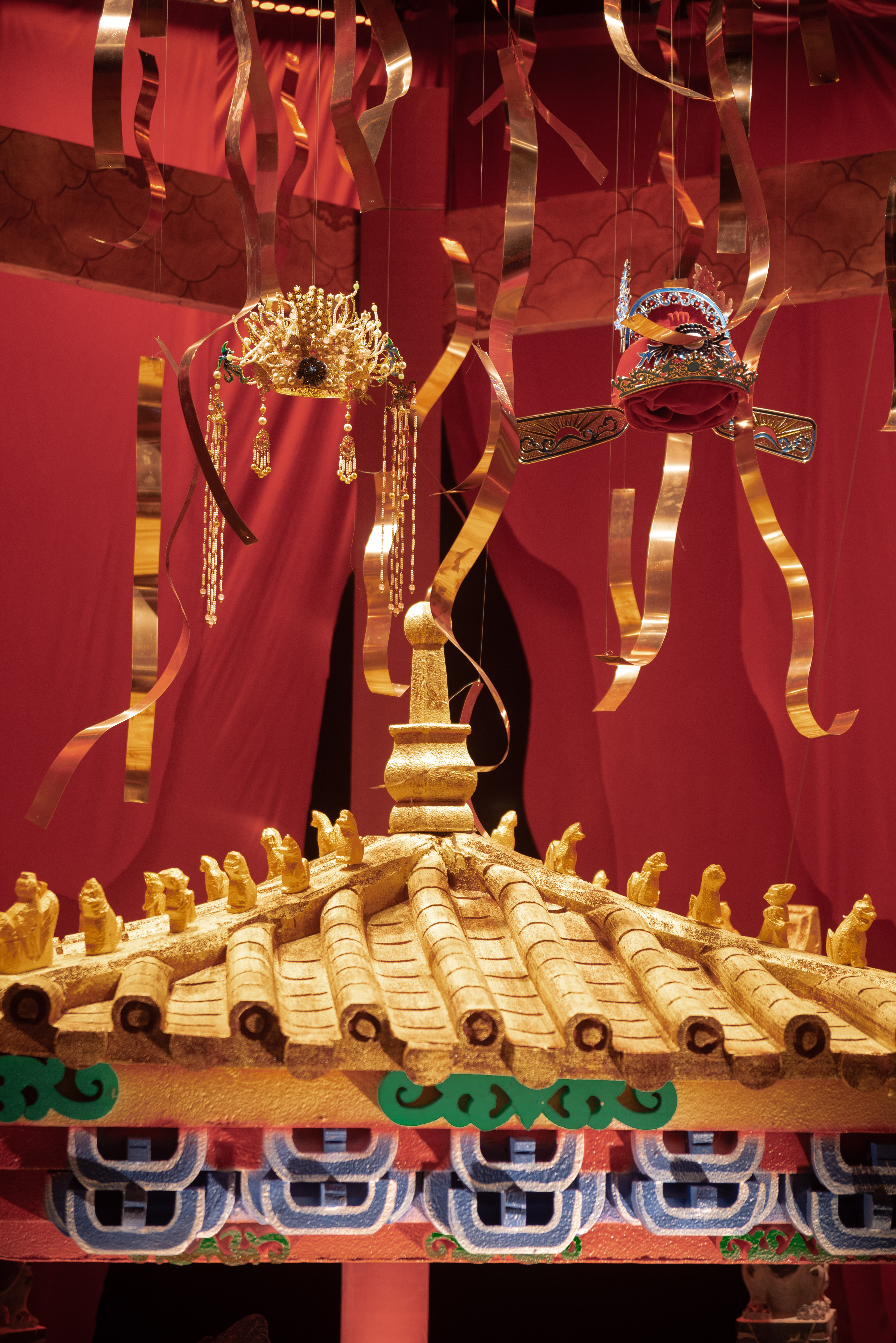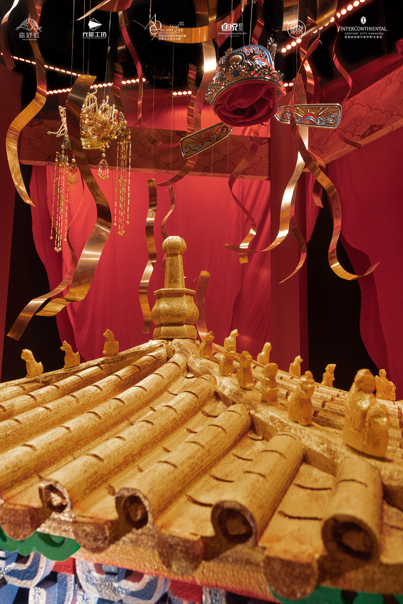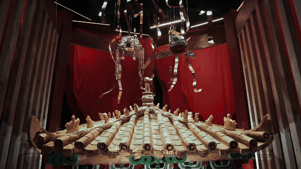 以象征皇城的皇家房檐和传统中式喜帐红为主体,其间红墙黄瓦、榫卯衔接、兽脊栉比,在细节上完美复刻中式建筑的结构之美。