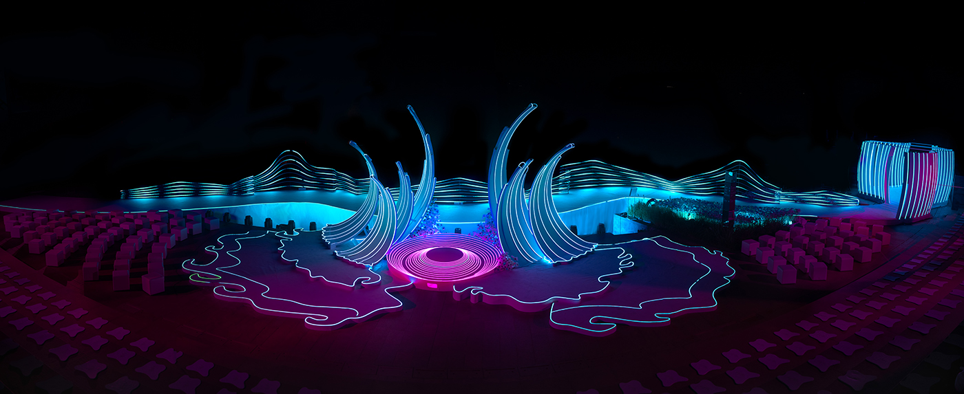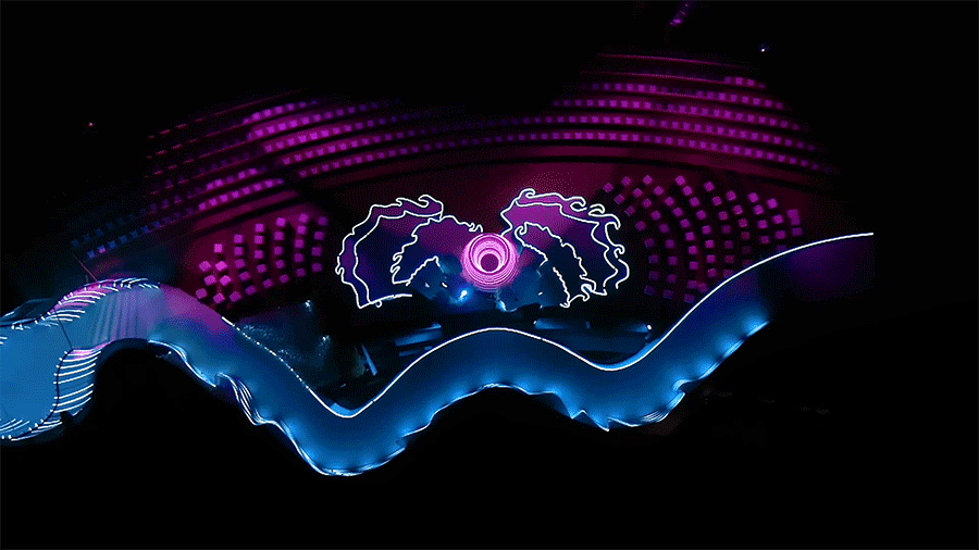 在灯带的变化下,如一阵阵风,从湖面上奔涌而至。