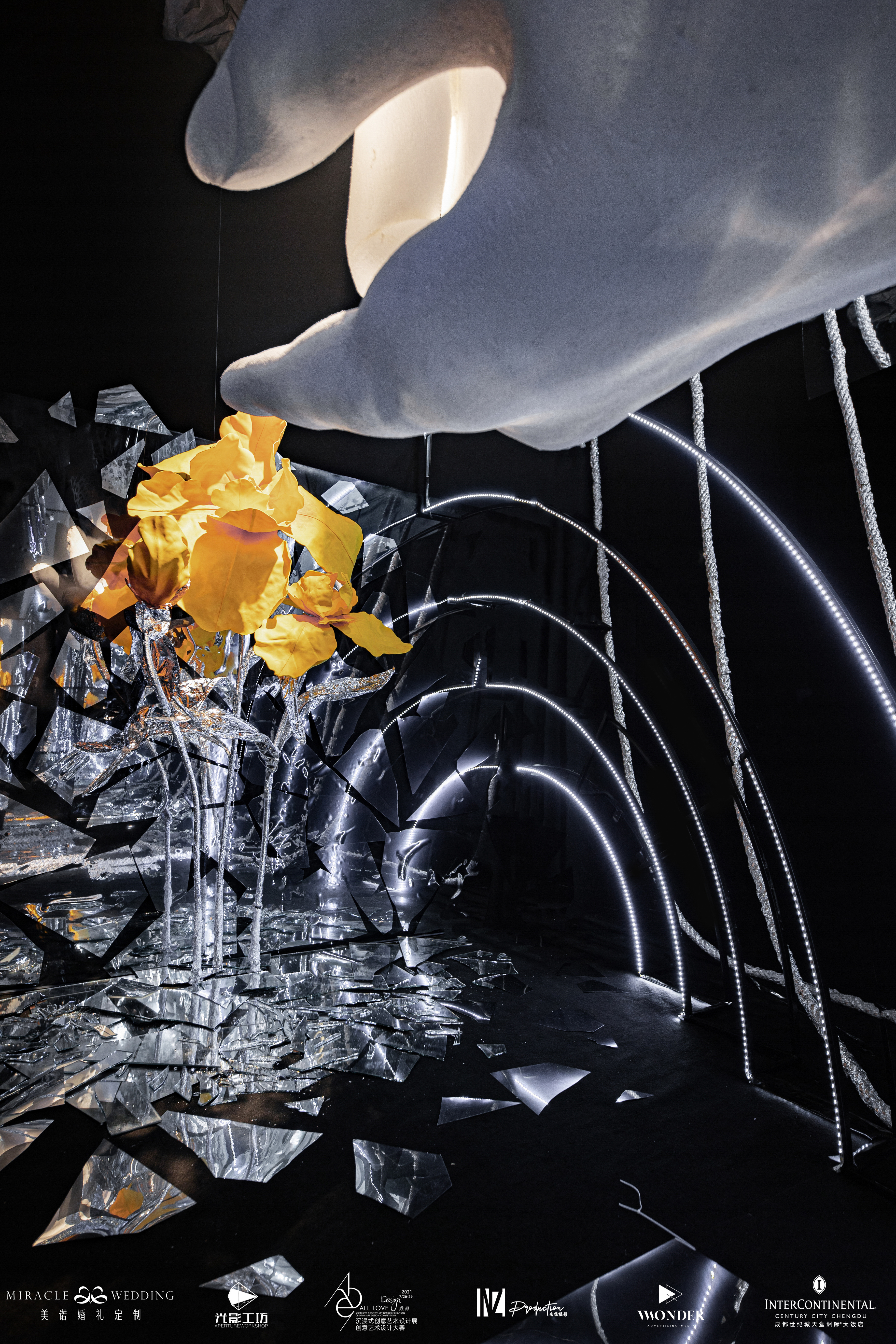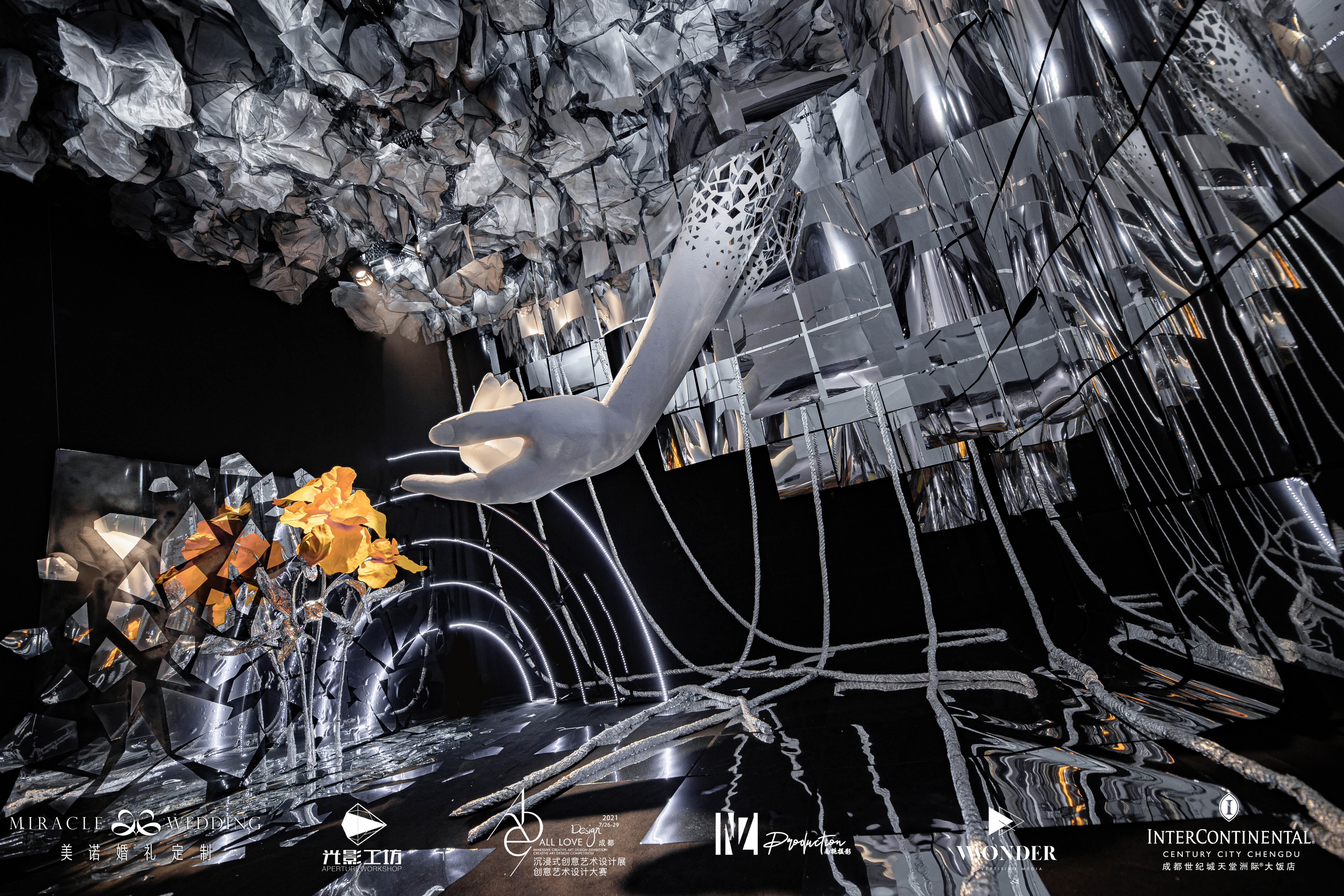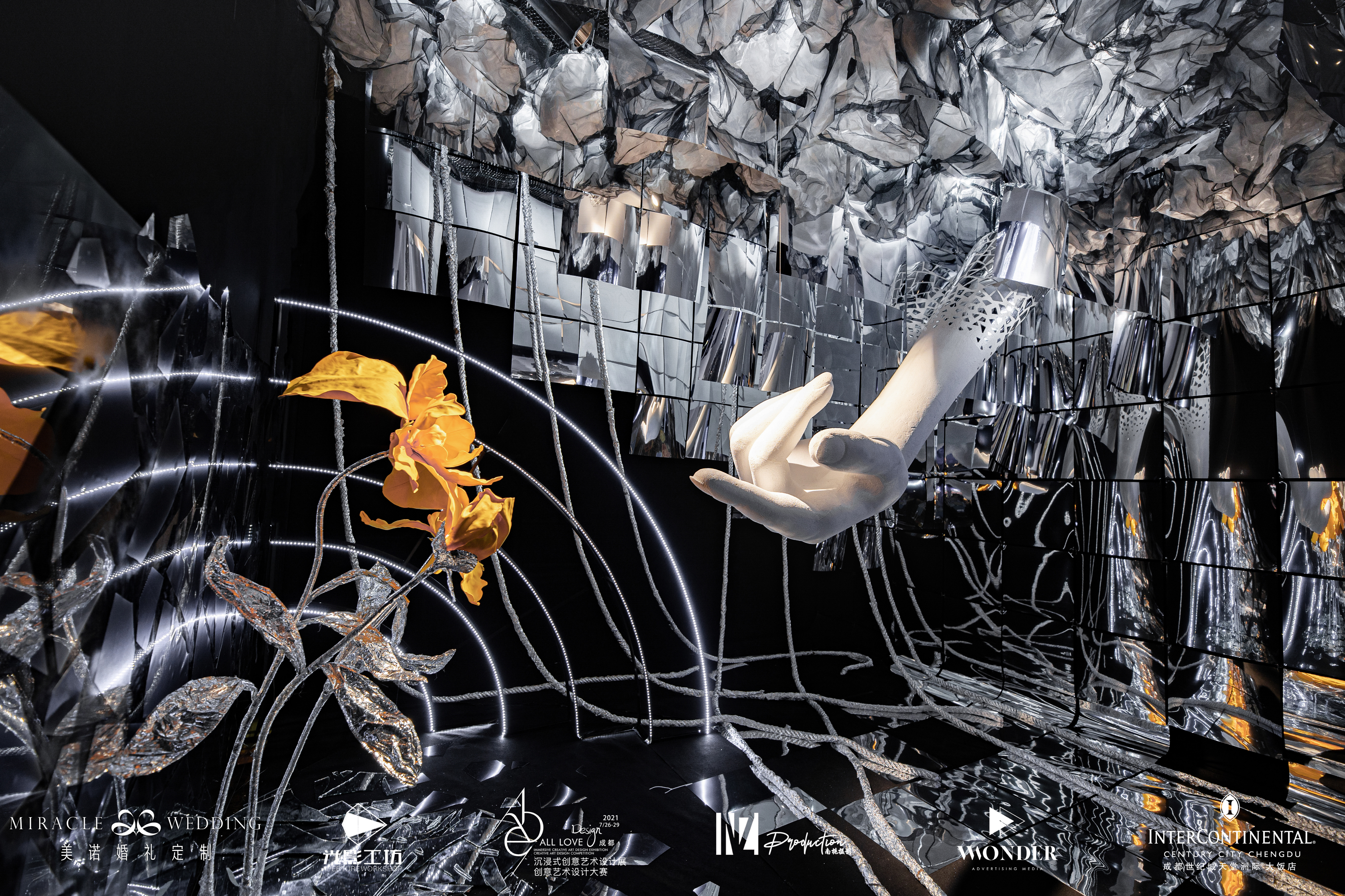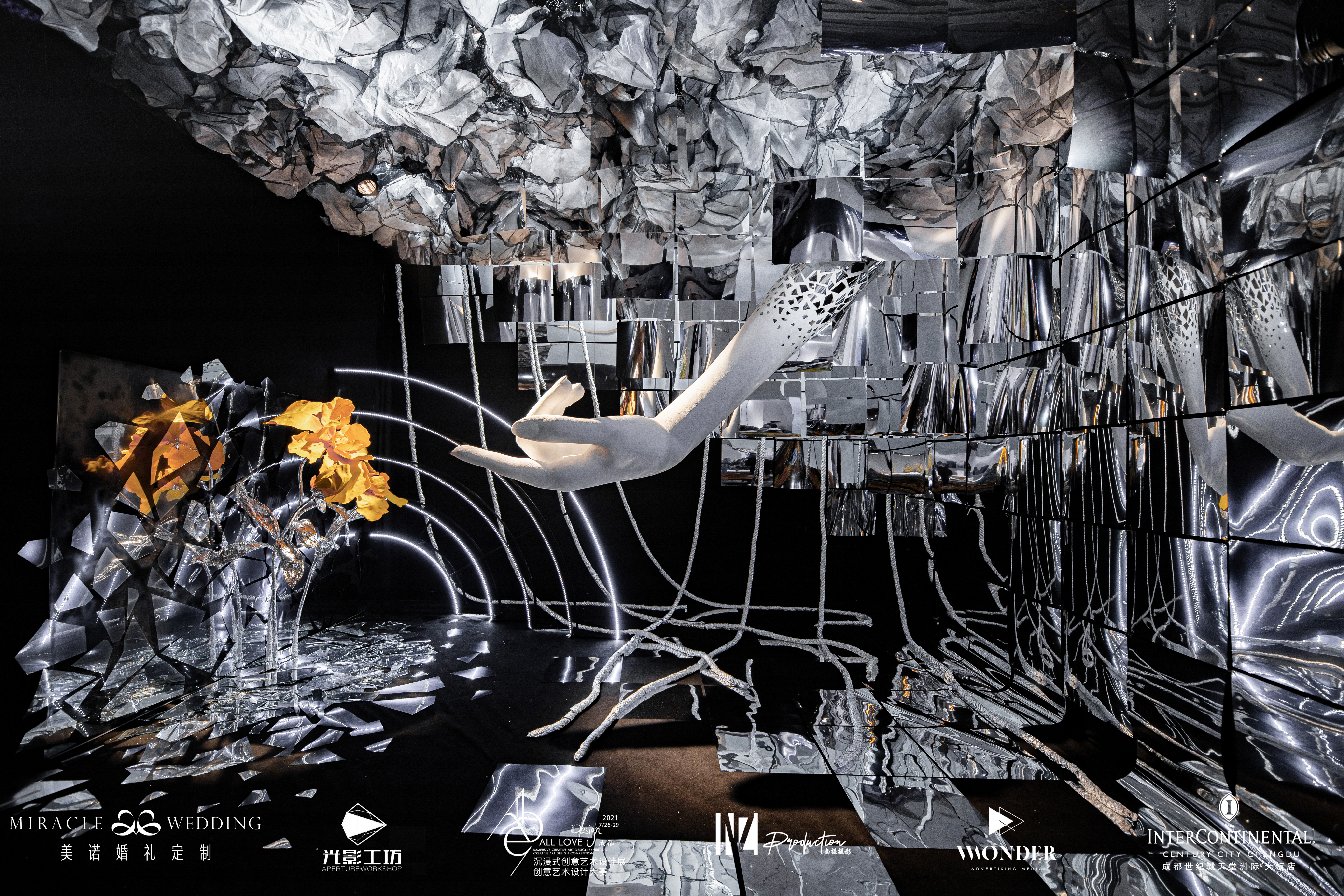 在银白色的镜面世界中,破碎的镜子和反射光泽的材质交互搭配焕发神秘细腻的质感,让空间产生虚实丰富的效果,